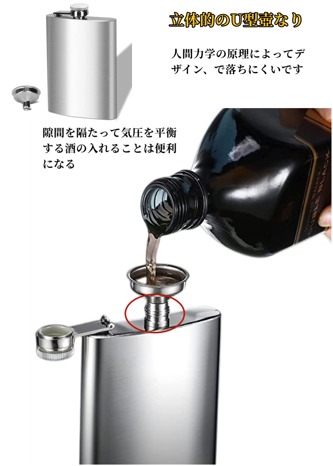 【特別なデザイン】人間力学の原理によって、瓶の表面にはU型を設計して手によりフィット仕上げますので落ちにくいです。瓶とふたは一体の構造になっている一体型のウイスキーボトル、ふたを紛失する心配はありません。