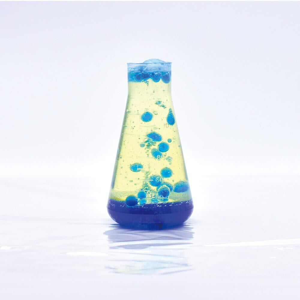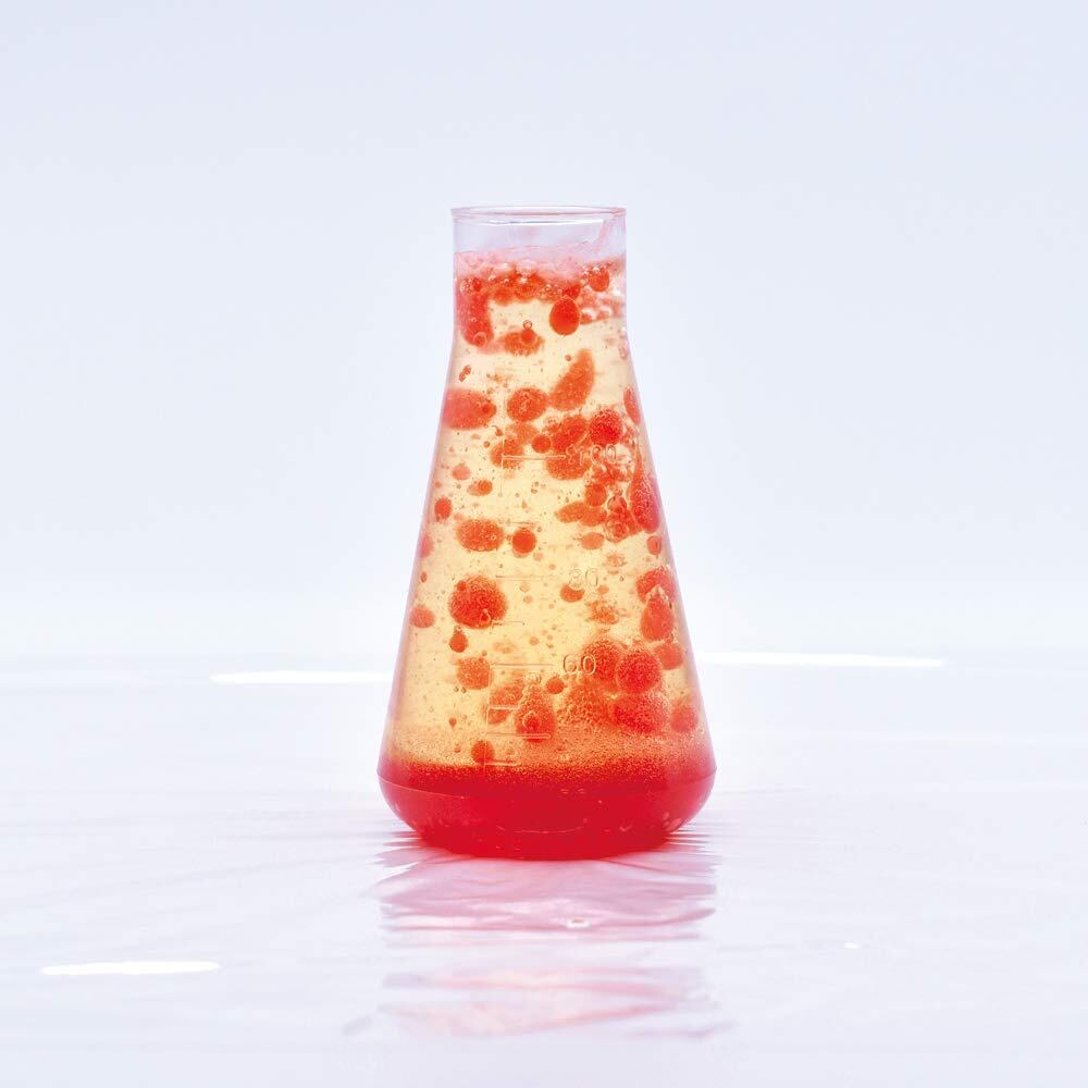 化学反応でがガスを発生させ、フラスコの中で踊る水玉の様子を観察できます。
