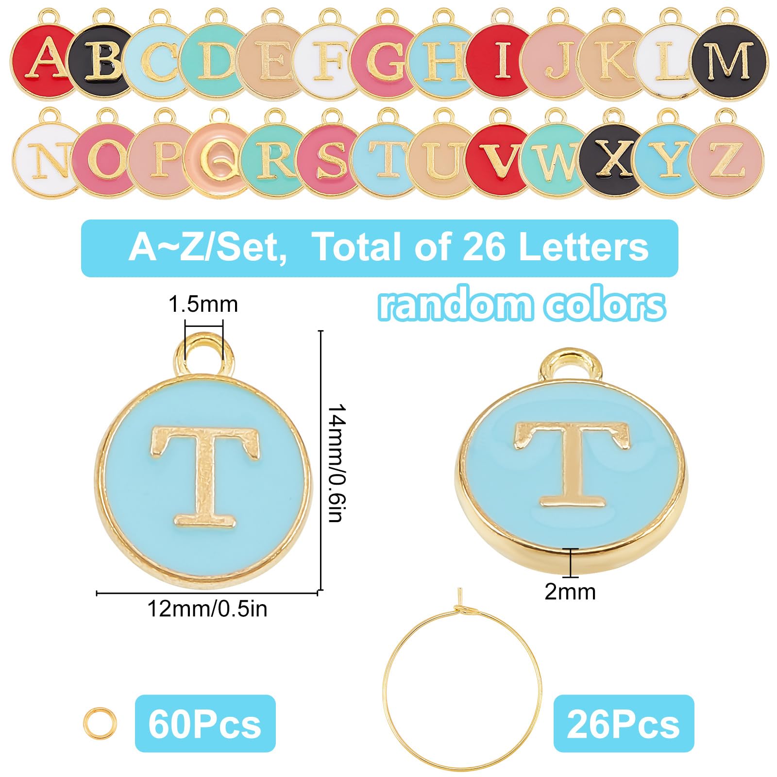 【独特なデザイン】:アルファベットチャームはA-Zの全26文字の模様を丁寧に選び、毎個アルファベットチャームはカラフルを背景に金色のアルファベットを印刷し、非常に特別なデザインです。