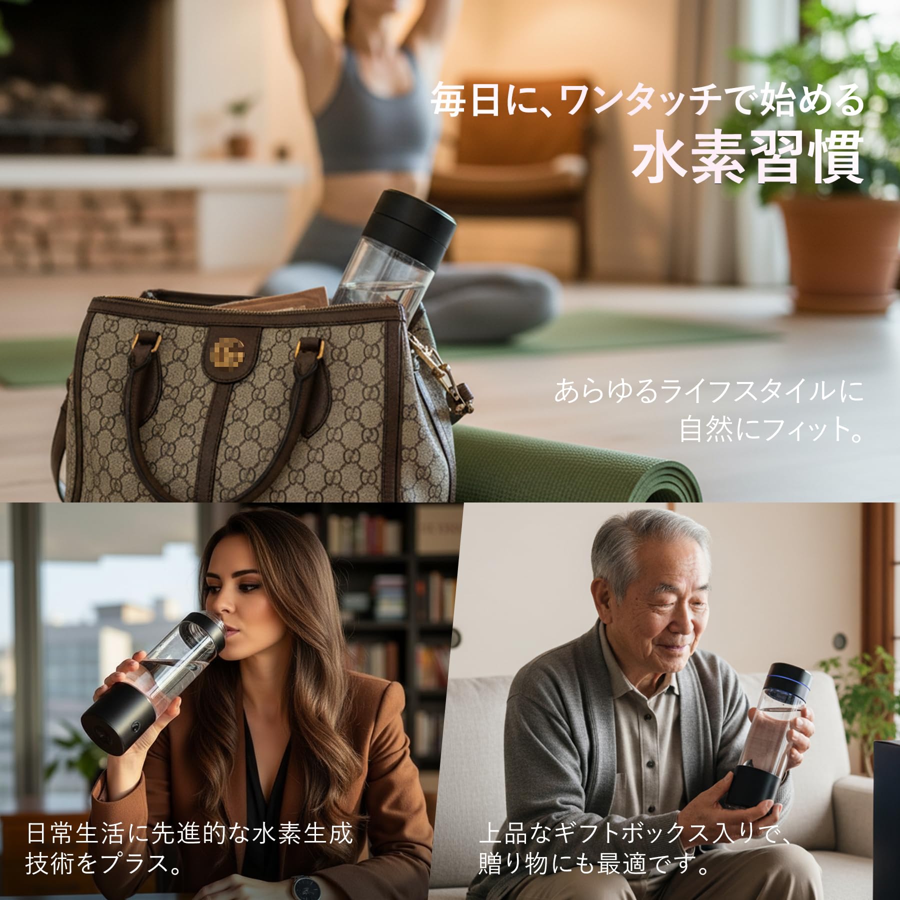 【4-in-1多機能デザイン】GasClubの水素水ボトルは、水素水生成・ペットボトル接続・水素吸入・電解洗浄の4つの機能をひとつにまとめた多機能モデルです。ご自宅やオフィス、外出先でも、ライフスタイルに合わせて手軽にご利用いただけます。