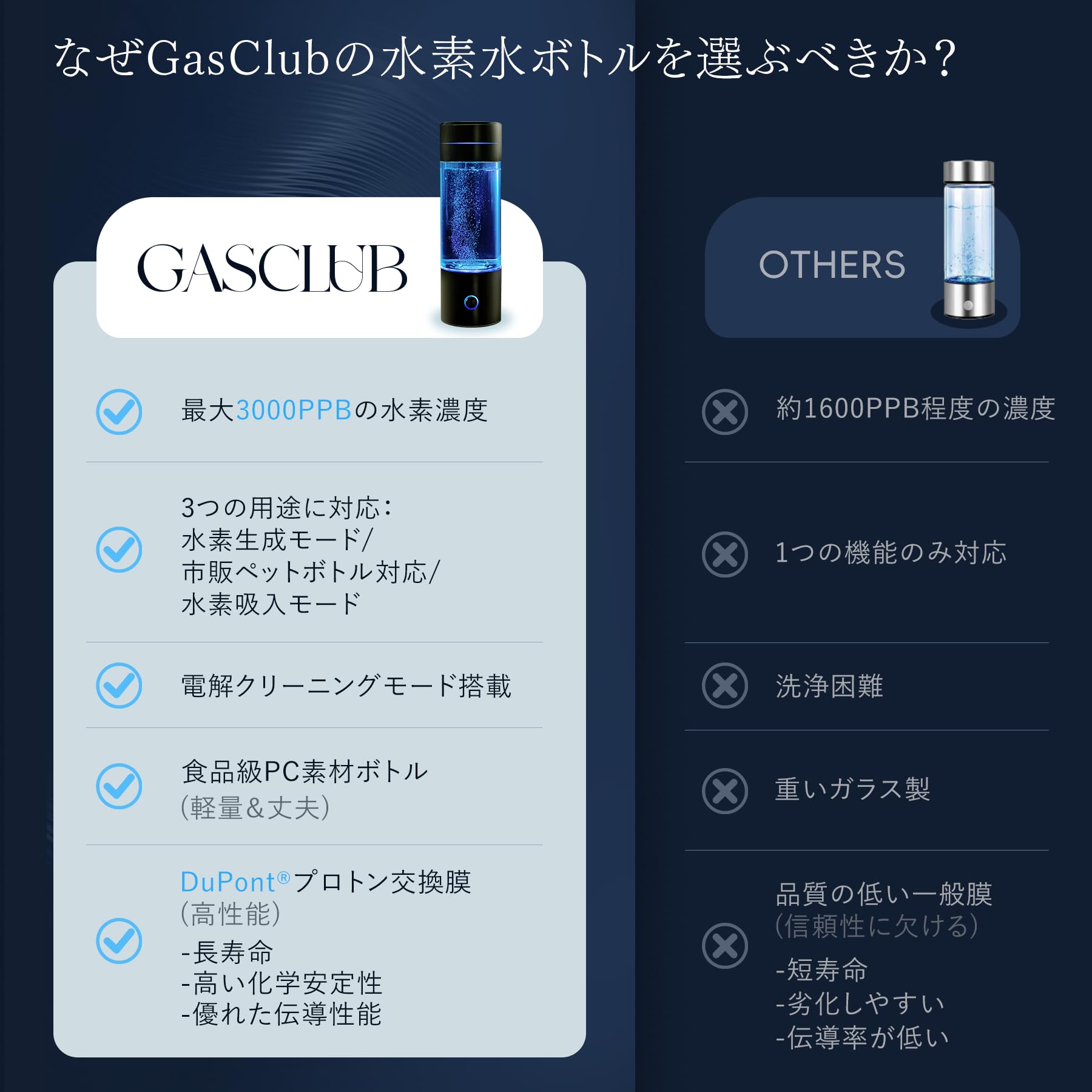 【最大3000PPBの高濃度水素を生成可能】本製品は、最大3000PPBの水素濃度を実現できる高性能モデルです。これは一般的なエントリーモデルの約2倍に相当し、より多くの水素を取り入れたい方、水素生活を本格的に始めたい方にもおすすめです。