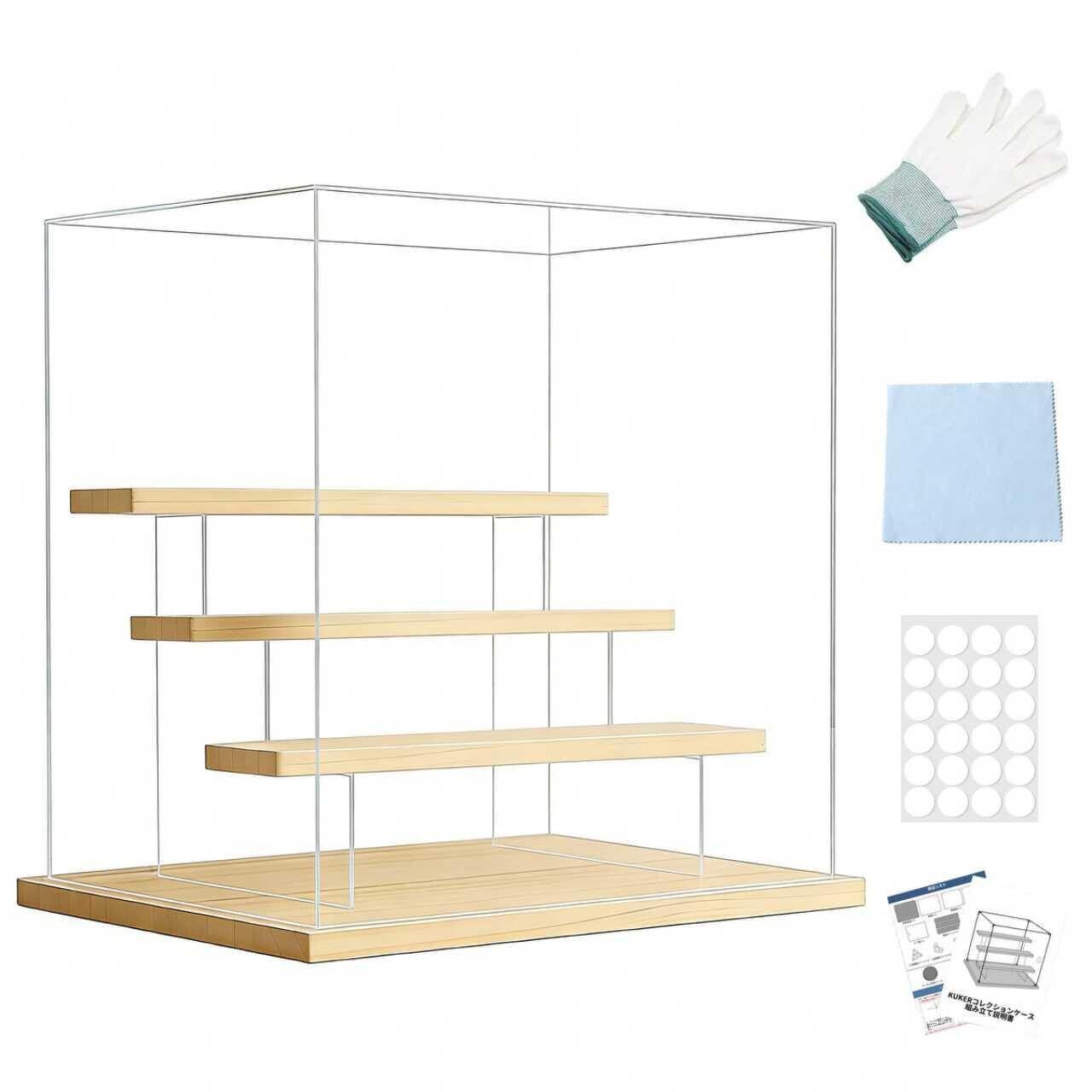 フィギュアケース アクリルケース コレクションケース LED照明付き ディスプレイケース クリアケース ショーケース 展示ケース グッズ ひな壇 扉付き 木製 頑丈 汚れ防止 組み立て簡単 手袋 クリーニングクロス付き (透明天板, 幅32×奥行26×高さ30cm)