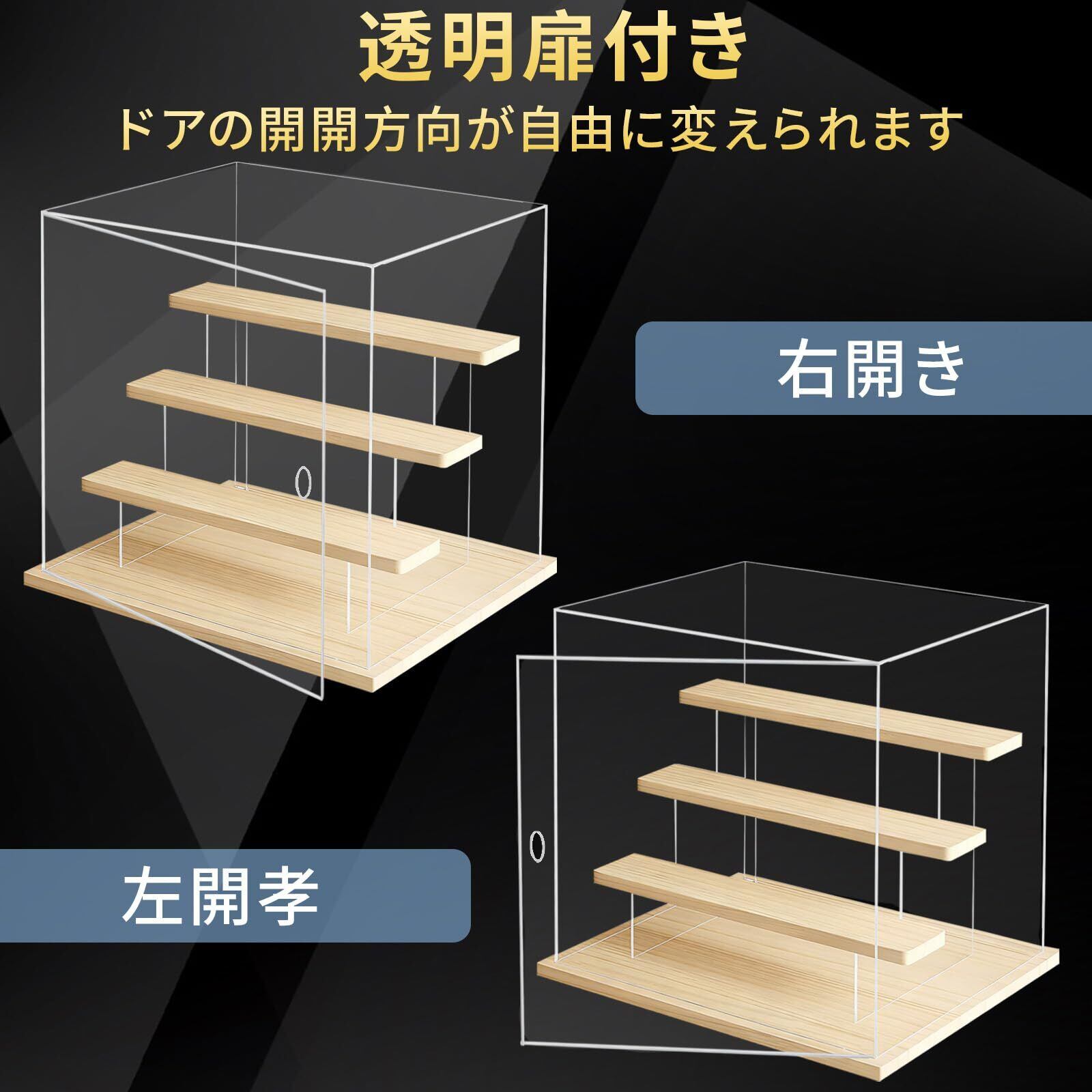 【立体的な陳列設計】内蔵された階段式展示台により、奥行きと高さを活かした立体配置が可能。コレクションの魅力を多角的に際立たせます。透明扉は180度フルオープンでき、作品の出し入れがスムーズ。開閉方向も左右どちらにも切り替え可能です