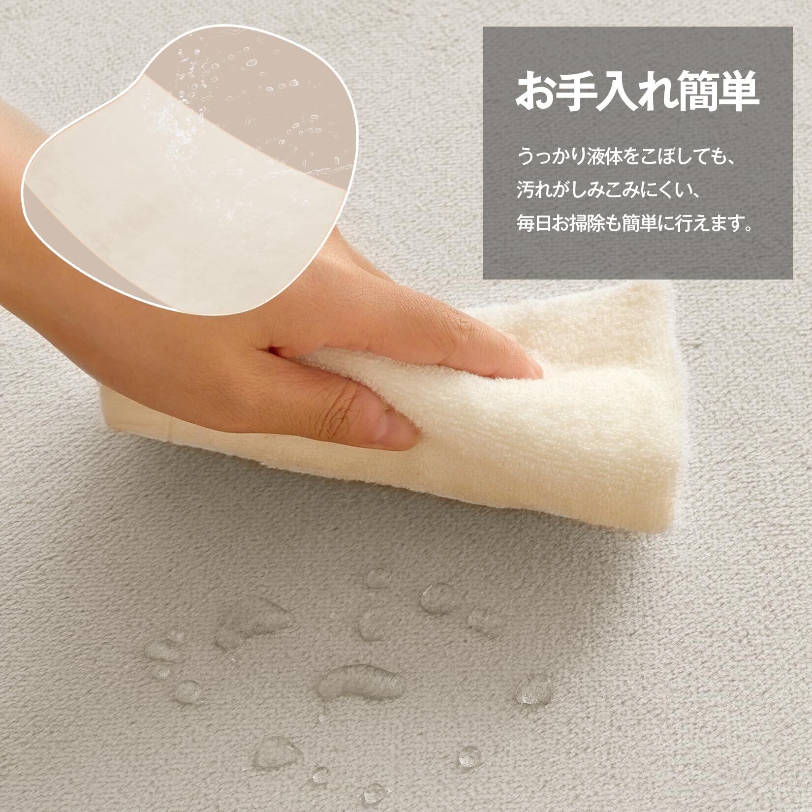 【お子さまやペットのいるご家庭に嬉しい<はっ水加工>・滑り止め付きのラグ】液体をこぼしても、カーペット表面で水玉状になるのでサッと拭くだけ!汚れが付きにくく、お手入れ簡単です。(防水ではありませんので放置すると染み込む恐れがあります。早めにお拭き取りください。)滑り止めも付いていて、床面をしっかりキャッチしてより滑りにくくなりました。掃除機をかける時も滑らないのでストレスから解放されます。