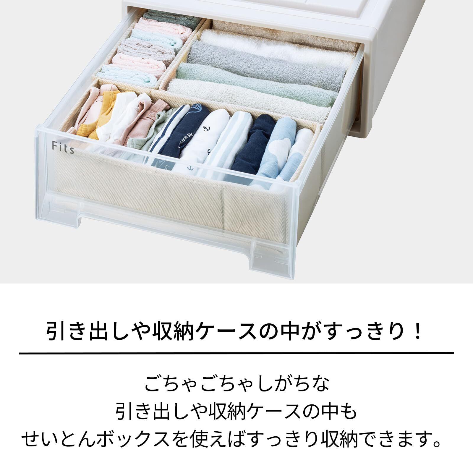 収納ケースの中を整理整頓できる布製ボックスです。靴下やハンカチ、子供用グッズ(スタイやよだれカバー)など小物の整理におすすめです。