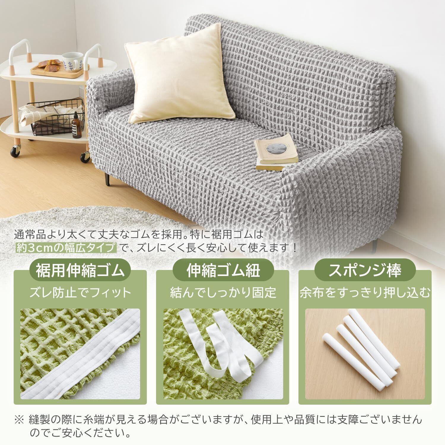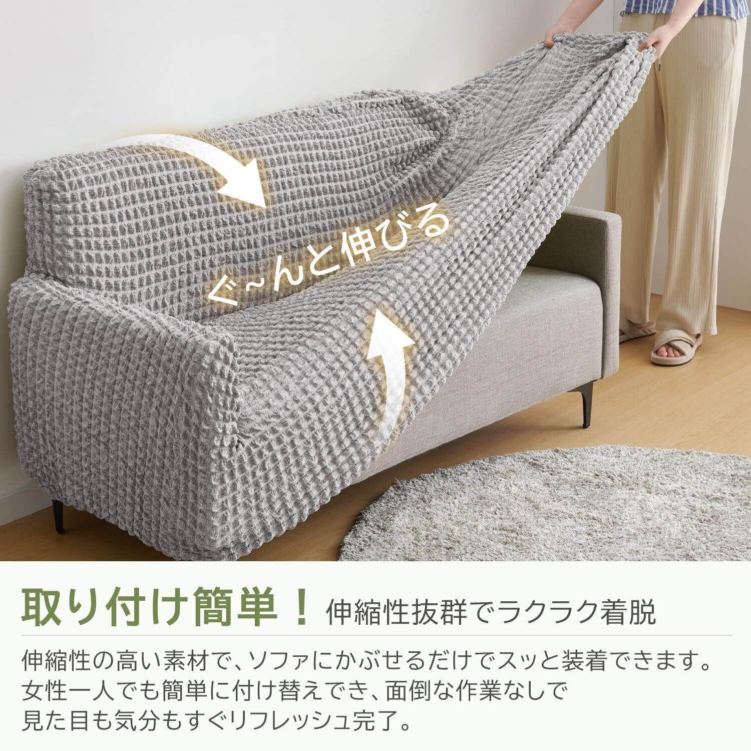 【通常品より伸縮性アップ・ラクラク装着】縦横に伸びる2WAY素材でソファにぴったりフィット。凹凸や角まで美しく包み込み、自然なシルエットを保ちます。カバーをかぶせるだけで簡単装着、女性一人でも付け替え可能。通常品より太くて丈夫な、幅3cmの幅広ゴムを採用し、ズレにくく、長く使えます。