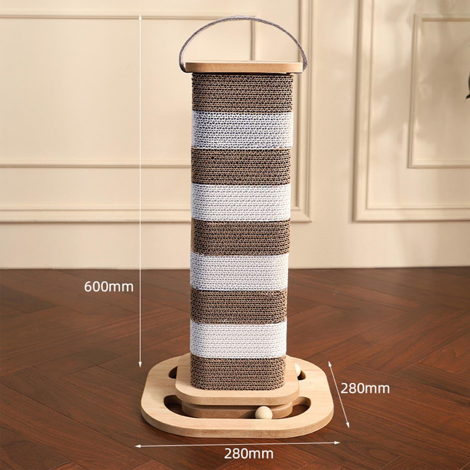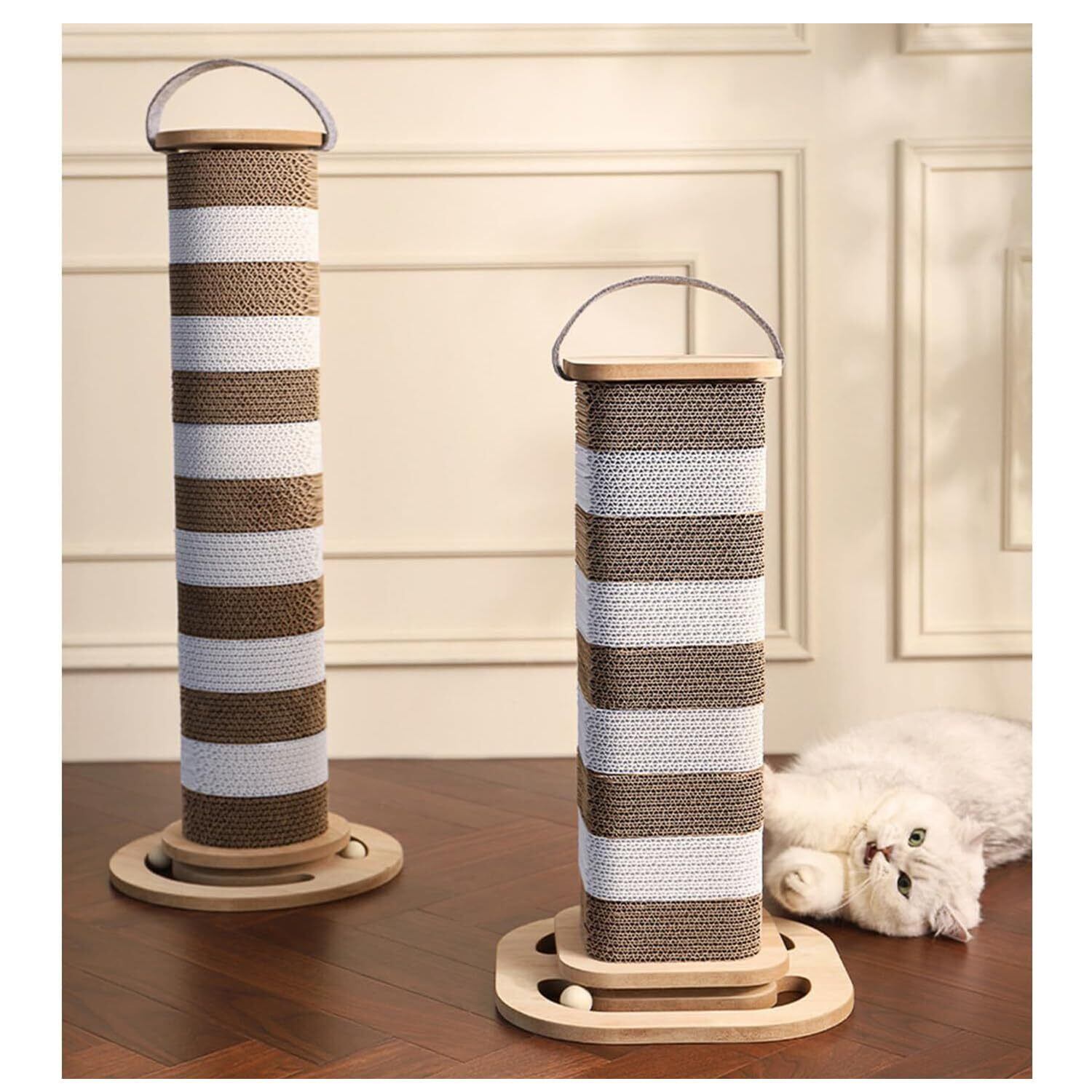 【安全素材の猫のおもちゃ 人気の遊び機能で運動不足解消】 柱部分は丈夫な厚紙製で、心地よい爪ざわりとともに長時間の使用に耐えます。さらに、台座部分には転がして遊べる木のボールを設置。爪とぎだけでなく、好奇心を刺激して遊びながら運動不足解消が叶う、猫ちゃんのための総合プレイスポットです。