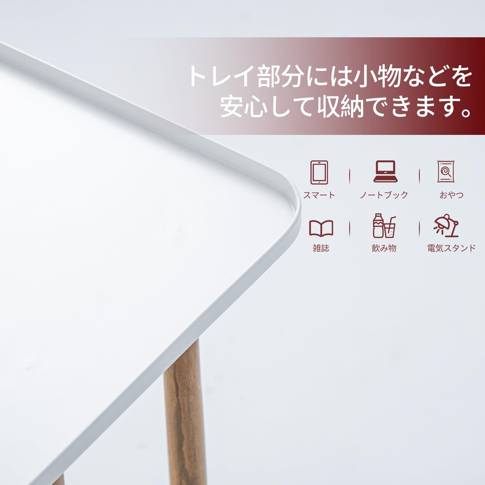【多機能サイドテーブル】:白いトレイと木目調の脚が、どんなインテリアにも調和するシンプルでおしゃれなデザインです。コ型ベースにより、ベッド、ソファやチェアの下の脚にスムーズに差し込めるので使いやすさ抜群であります。