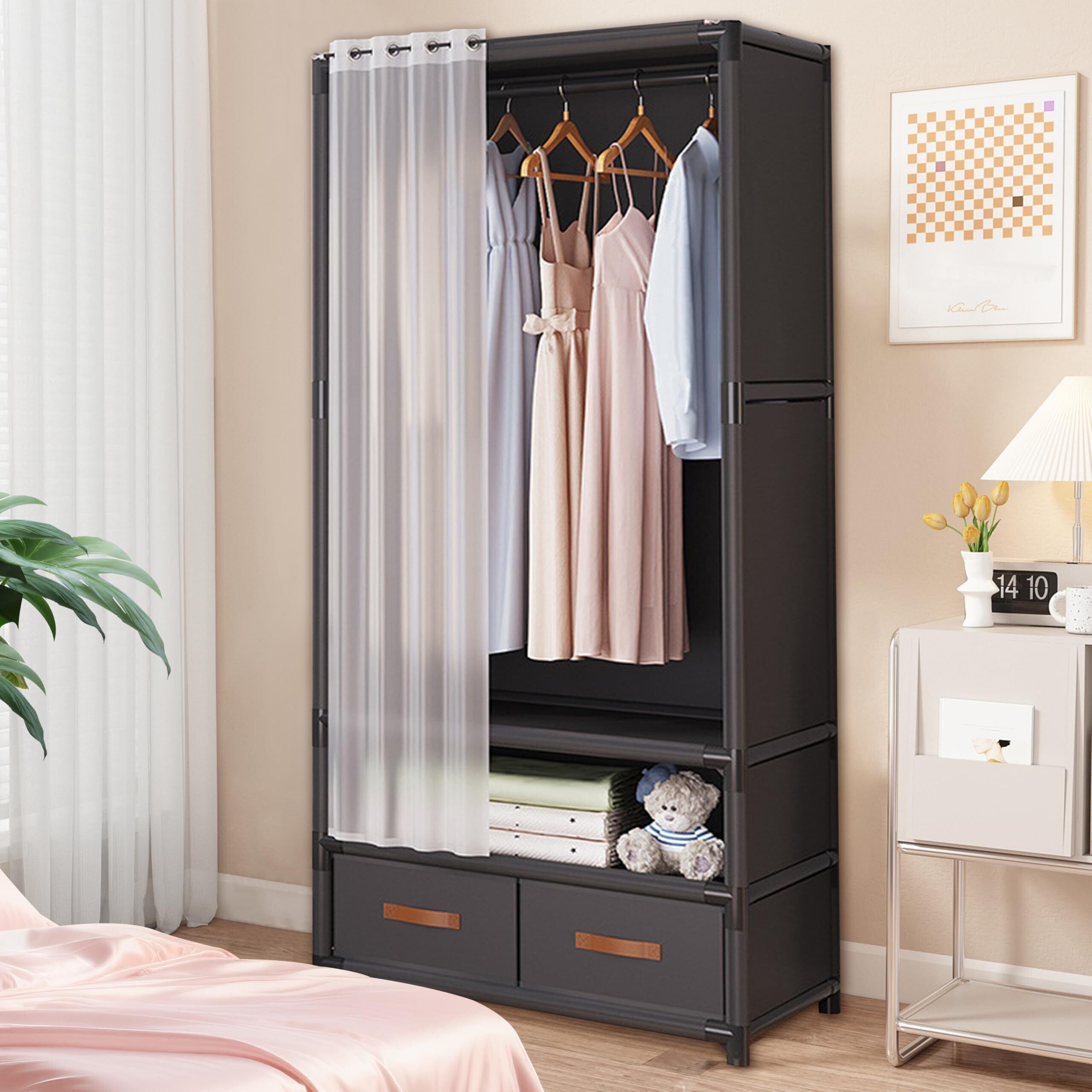 【分類収納デザイン】:クローゼット科学的かつ合理的な区画計画を通じて 立体的な収納システムを構築しています。上部の吊り下げスペースは 様々な種類の衣類を吊るしやすくなっています。中間のオープン式棚は 枕 バッグ おもちゃなどの小物を柔軟に収納することができます。ドアカーテン付き 多機能 ハンガーラック 下部の 2 つの引き出しは ソックス 下着などの身近な日用品を専用に収納するためのデザインで 1 つ 1 つの物がそれぞれの専用収納スペースを見つけることができ 整然としていて 日常の取り出しも便利です。
