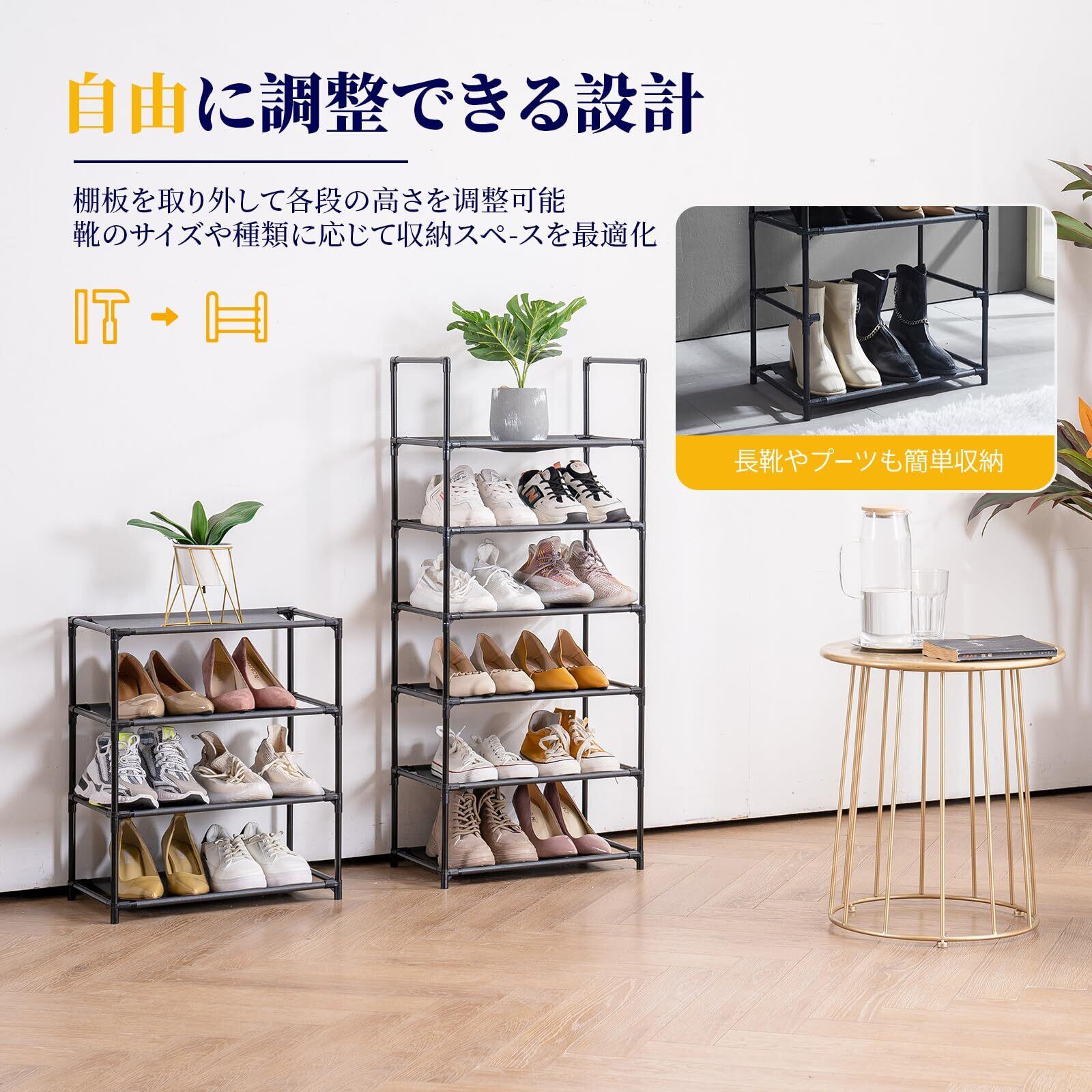 【丈夫でしっかりとしたシューズラック】1.太い鉄パイプ- 直径13mmのプラスチックコーティングされた鉄パイプを採用。防錆加工が施されており、優れた耐荷重性を持ち、長期間の使用でも変形しにくい靴箱です。2.防水層付き不織布- 高級コーティングが施された丈夫な不織布は防水性があり、水滴や埃も簡単に布巾で拭き取ることができ、シューズラックの清潔を保ちます。3.耐摩耗ジョイント-高強度の環境配慮型PPプラスチック材料を使用したジョイントが、パイプをしっかりと支え、靴ラクを安心して使用できます。