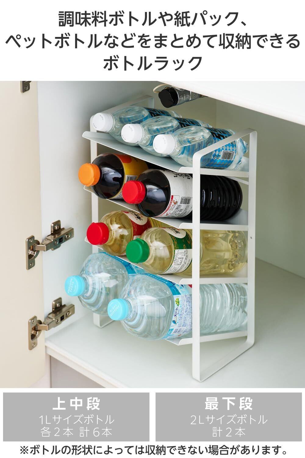 ■たっぷり入る4段のボトルラックで、上中段には約1Lサイズのボトルを約6本、最下段には約2Lサイズのボトルを約2本収納可能です。