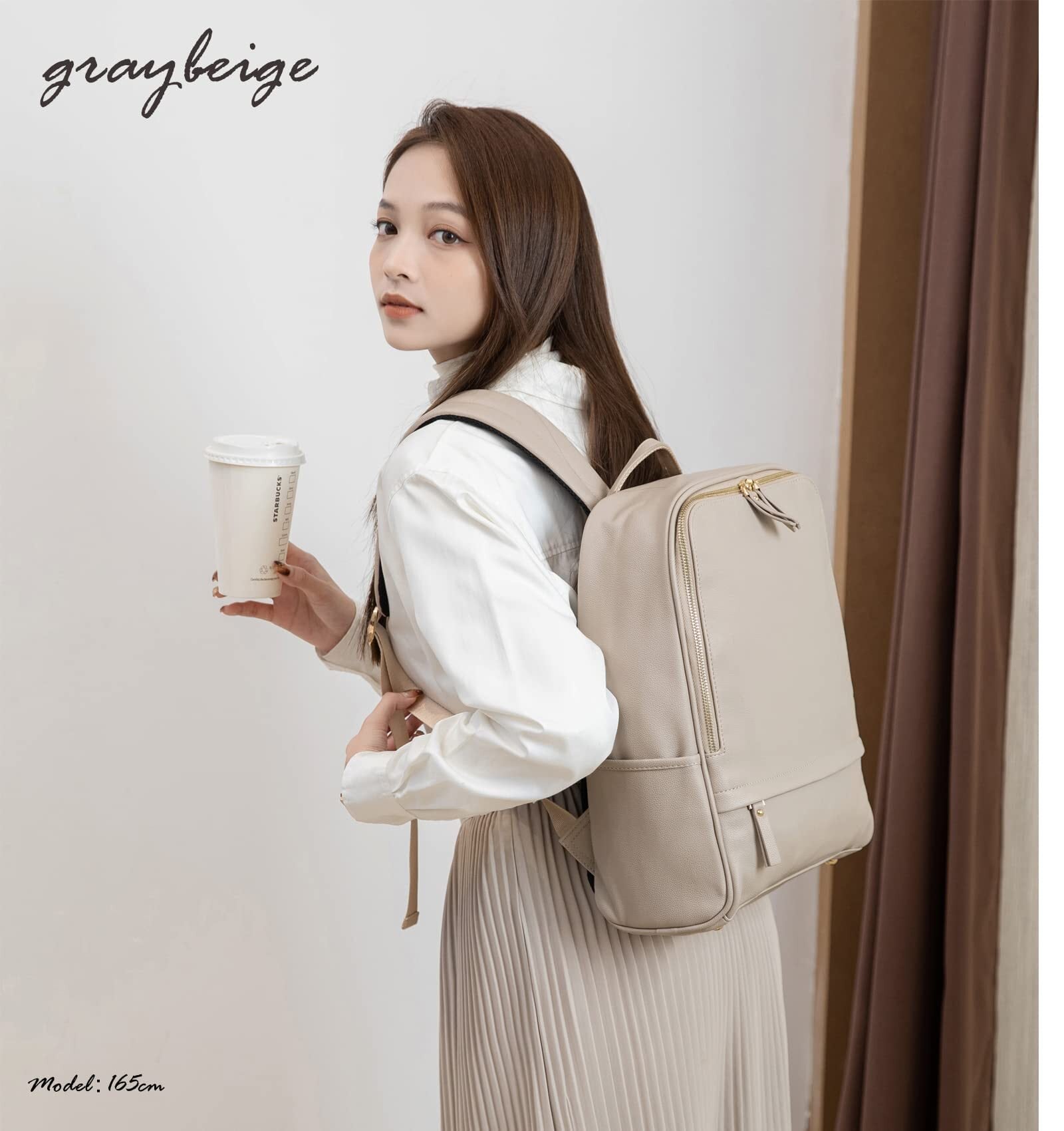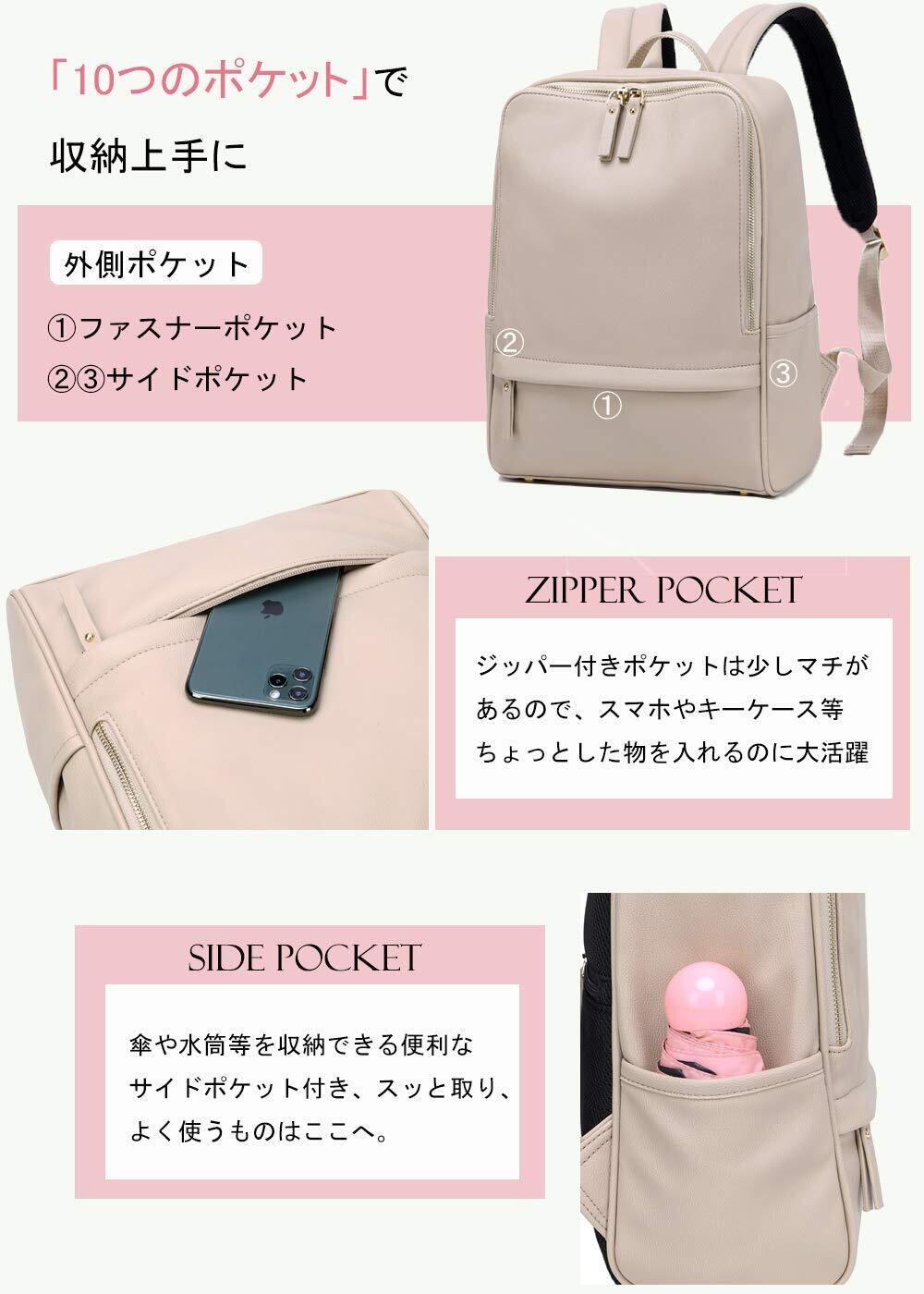 【パソコンが入るリュック】 上質な合皮 レザー素材を使用したキレイめな女性向けリュックサック。 パソコン収納スペースも備えられ、14インチ以下のノートPCもスマートに収納できます。 洗練されたデザインと防水性の組み合わせで、ビジネスシーンやカジュアルな場面にもぴったりです。
