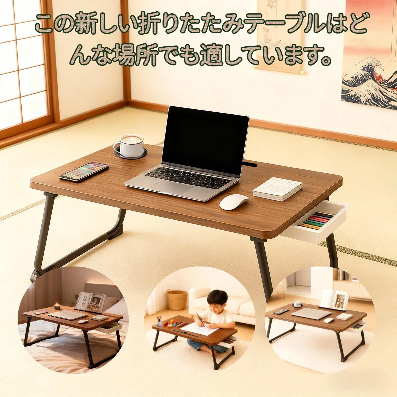 1、【コンパクトデザイン&スリム収納】低いテーブルとして使える折りたたみ時の厚さわずか5cmの折りたたみテーブルミニ!スリムなデザインで隙間やベッドの下にきれいに収納でき、一人暮らしの限られた空間を救う小さなテーブル。