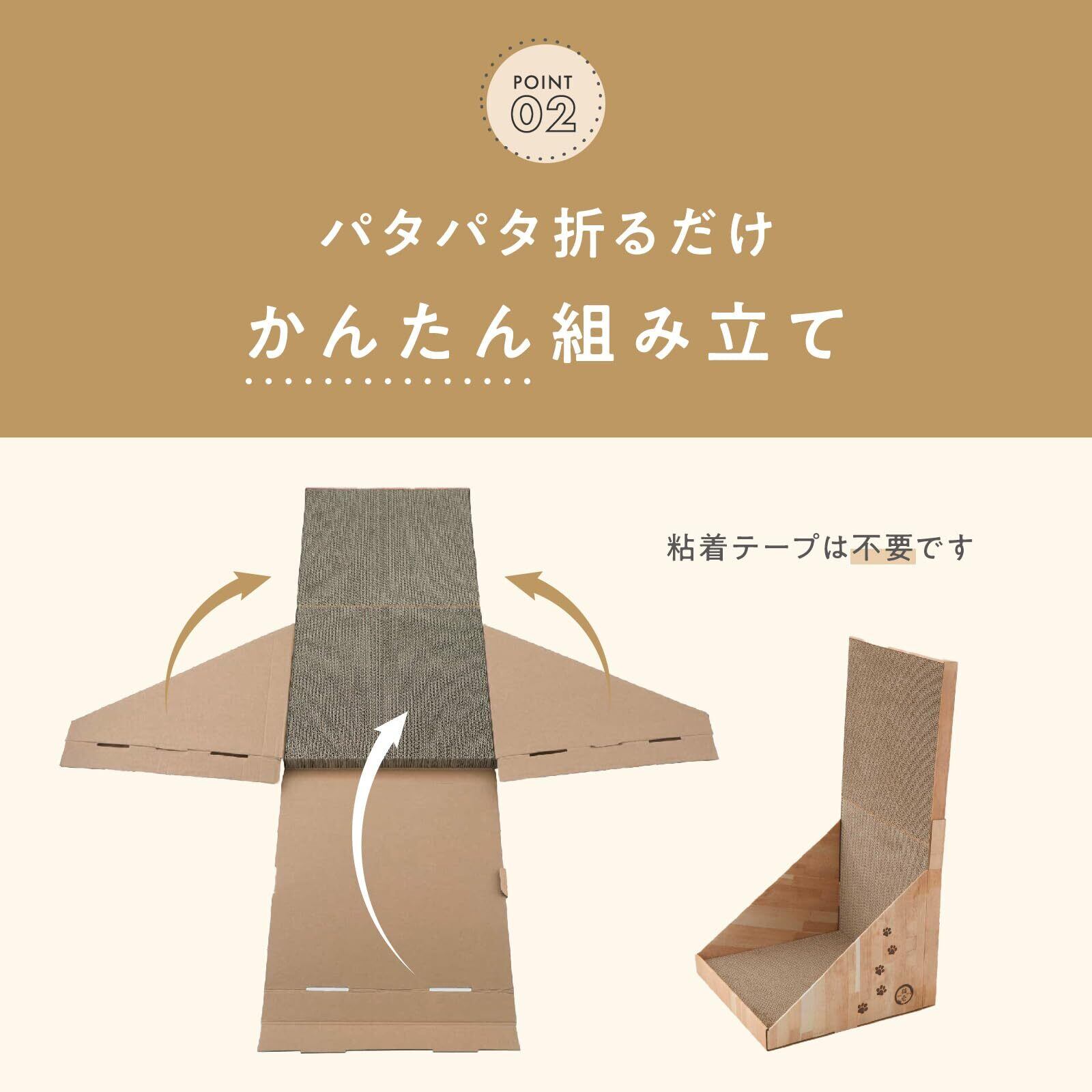【簡単組み立て&強力粘着テープでしっかり補強】 バリバリボードはつめとぎと外枠が一体式(底面つめとぎのみはめ込みです) パタパタと組み立てていくだけなので、力もいらず簡単に組み立てができます。 2つ折りになった背板部分のつめとぎを合わせるのに使用する粘着テープは強力タイプを使用。 また、合わせ部分の両側面とと背面は、付属の補強パーツでしっかりと固定します。