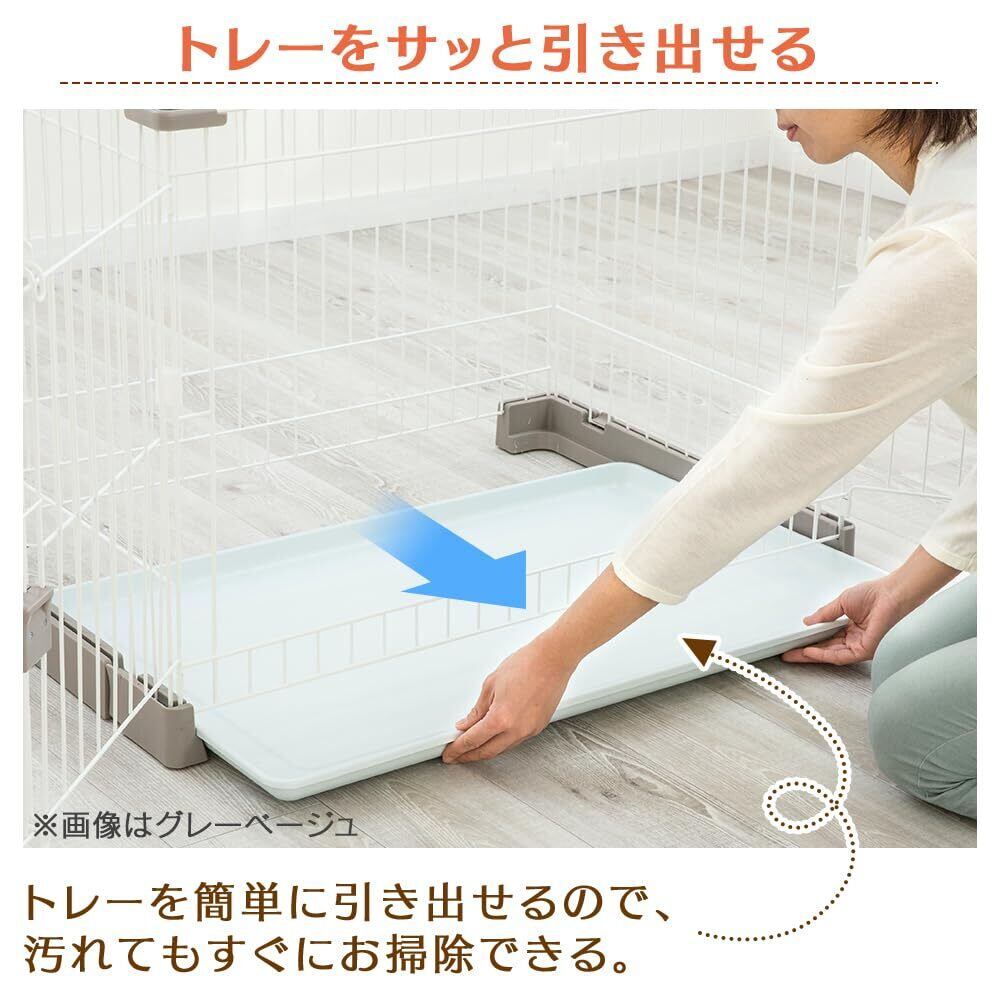 【商品説明】:3つのお掃除機能でお手入れが簡単なお掃除楽ちんサークルです。便利な仕切り付きで、トイレトレーニングに最適。留守番時等のペットの飛び出しを防止する屋根付き。【1】トレーが引き出せる 丸洗い可能。【2】扉がフルオープン 奥まで拭き掃除が簡単! 【3】コロ付きで移動が簡単! 床掃除に便利。