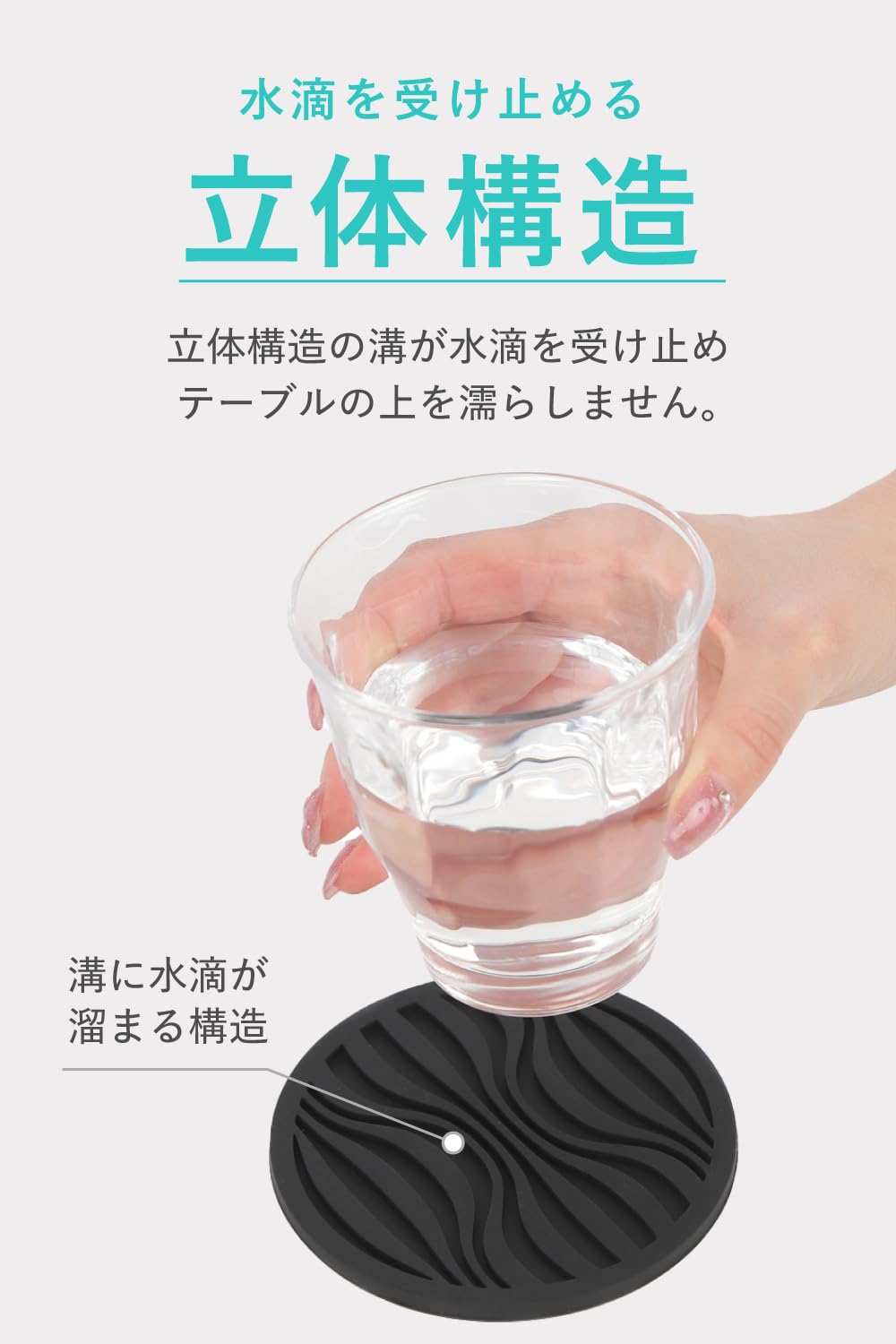 【耐久性&簡単お手入れ】 シリコン製 コースター 6枚セット 収納ケース付き 立体構造 水滴受け止め 滑り止め クッション性 傷防止 直径10cm (ブラック)