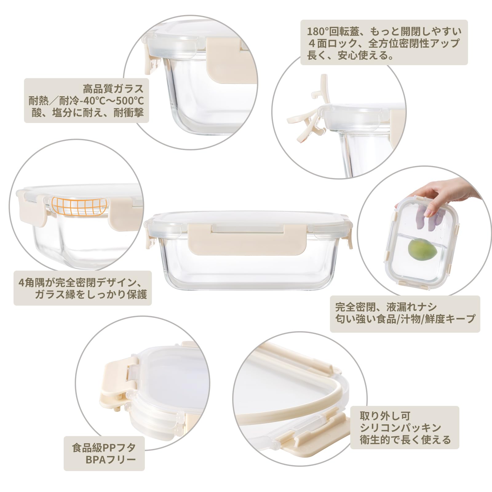 【完全密閉&汁漏れ防止】ガラス容器4面ロック式密閉蓋を採用し、180°回転可能で耐久性抜群!シリコン製パッキンが隙間なく密封し、保存容器の四隅は全面密封されており、食材を空気から守り、ご飯、作り置き、おかず、野菜、果物などの鮮度を長時間キープ。取り外し可能なシリコン製パッキンにより、完全密閉を実現、汁漏れしにくく、お弁当やスープの持ち運びも安心。冷蔵・冷凍保存対応、ご飯の冷凍保存でいつでも美味しく食べられます。
