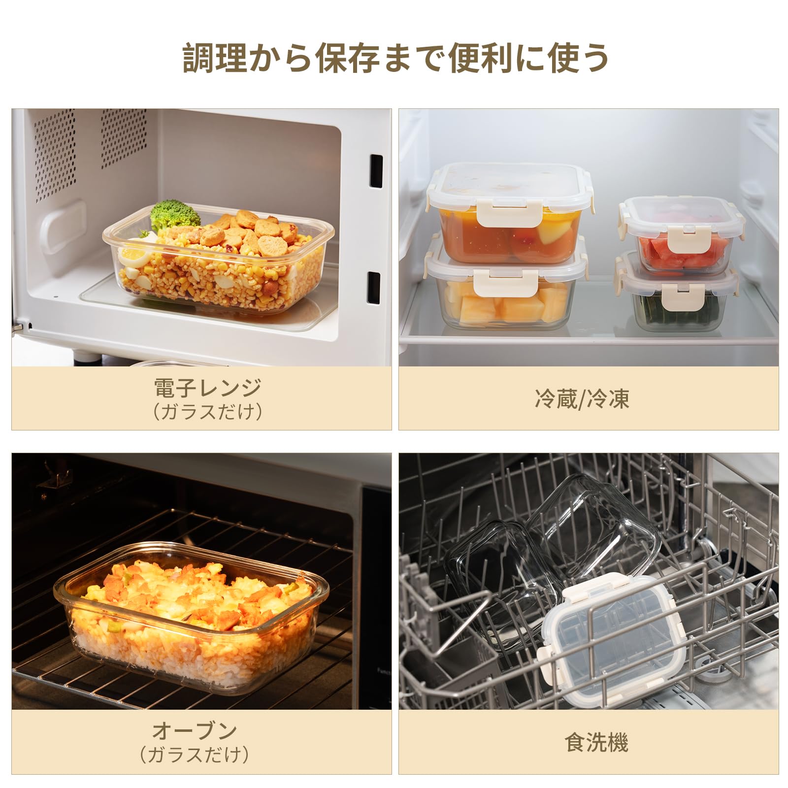【高品質素材】本体は高品質の耐熱ガラス容器である高ホウケイ酸ガラスを使用しており、強度・透明度・安定性に優れています。酸や塩分を含む料理にも強く、ニオイや色移りがしにくいため、長く清潔に使えます。中身が一目で見えるので、忙しい毎日でも冷蔵庫の中の食材が一目で確認できます。