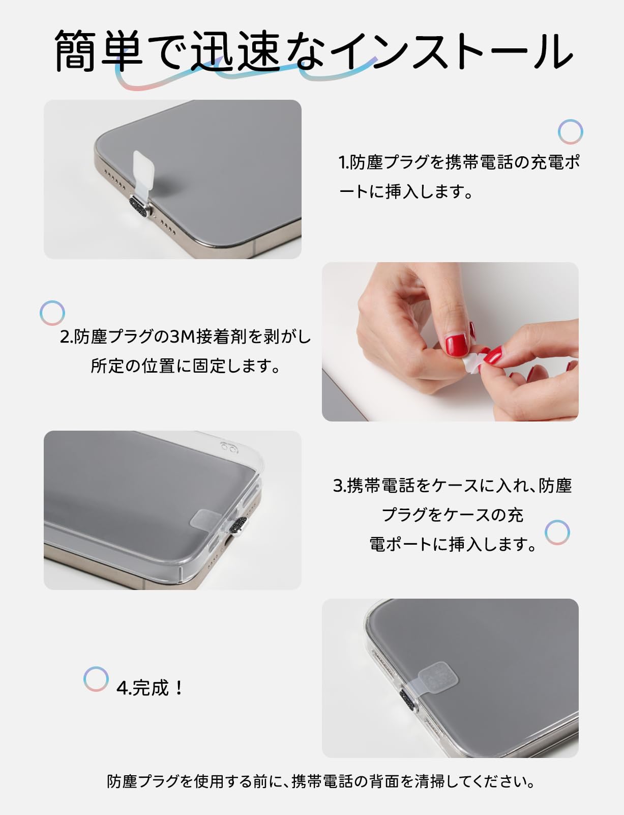 【高級感素材】環境に配慮したシリカゲルと合金材料を採用し、より耐久性が高い。強力に両面テープを接着し、スマホの背面にしっかり接着すると落ちにくい。全体とポートは良質なシリカゲル材質で、完璧な密着性があり、充電チップを損傷することはありません。カバーは合金製で、保護キャップを長く使用することができます。
