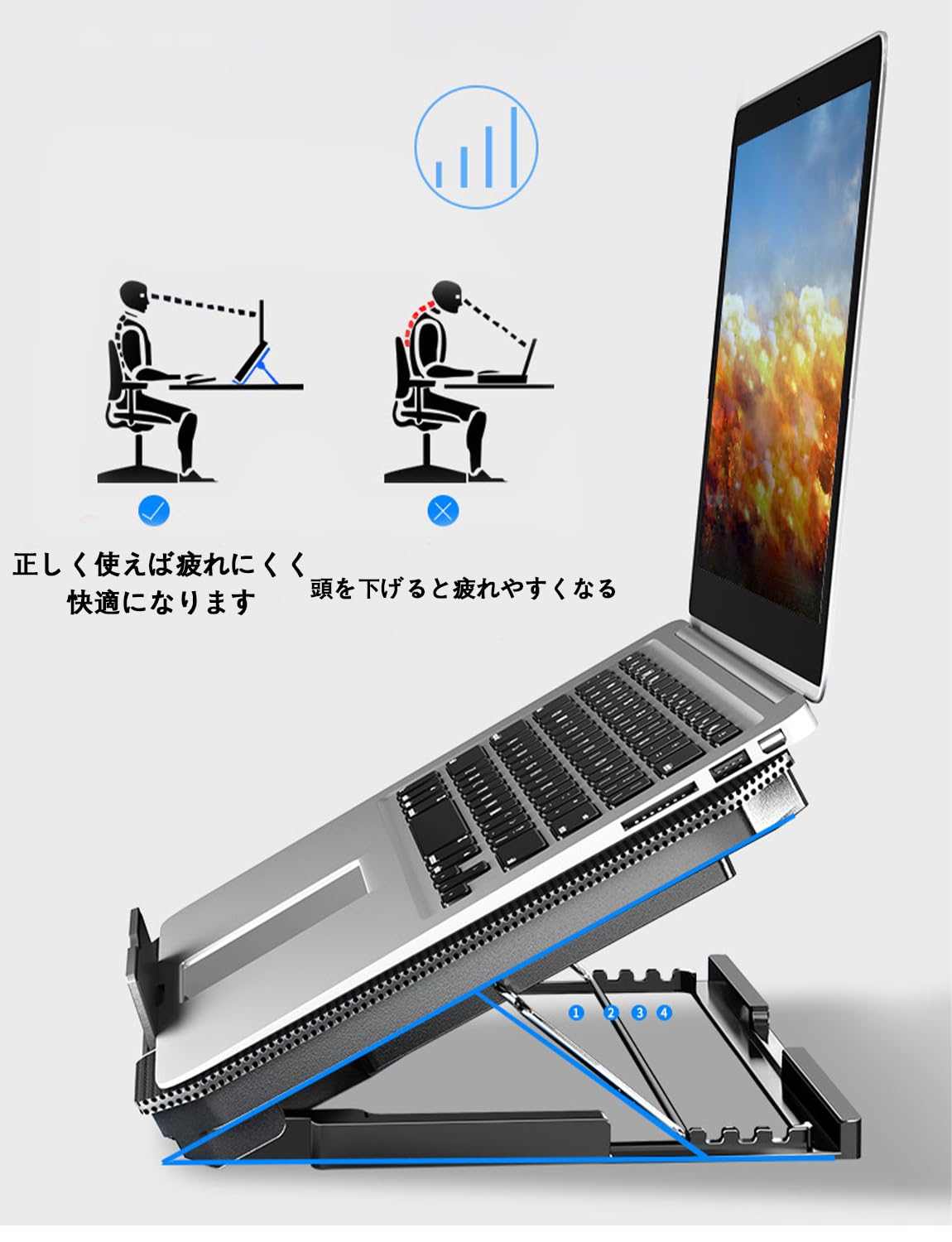 【人間工学に基づいたデザイン】5段階高度や角度調整可能多くの人の身長に適して、長時間のテレワークも首や肩に負担掛かりません。デスクワーク姿勢を矯正でき。ートパソコンの角度を0°~30°まで、目線が上がると背筋も伸ばしやすくなります 。