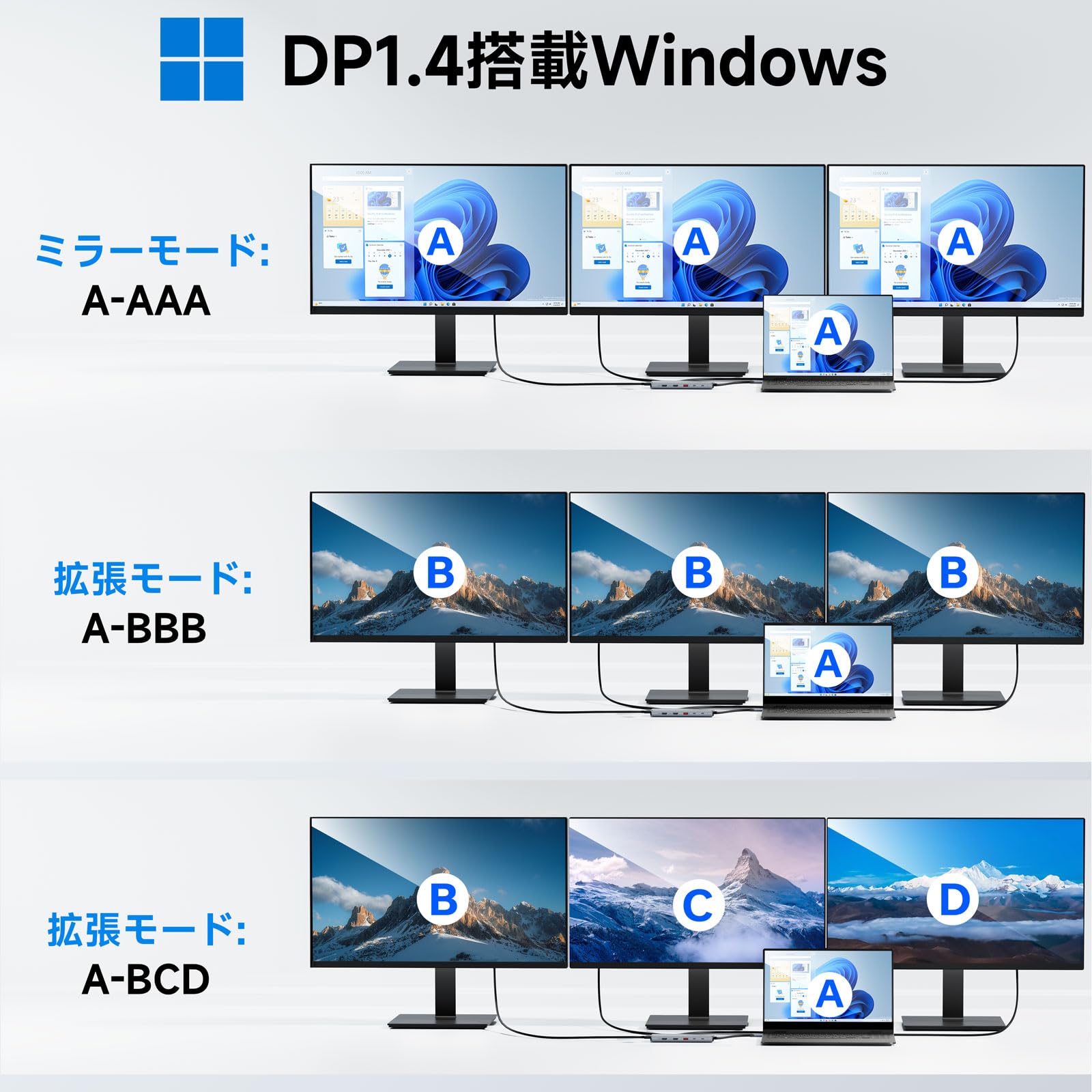 【3台接続可能なトリプルディスプレイドック(モード切替ボタン付き)】このUSB Cドック・トリプルモニターは、2つのHDMIポートと1つのDisplayPort経由で最大3台の4K@60Hzディスプレイ(ソースがDP1.4の場合)を同時にサポートし、生産性を次のレベルに引き上げます。専用のモード切替ボタンにより、ミラーモードと拡張モードをシームレスに切り替えることができ、必要に応じて拡張モードの設定を簡単に調整できます。(注:macOSの制限により、macOSラップトップはSSTモードのみをサポートしているため、すべての外部モニタ画面は同じです)