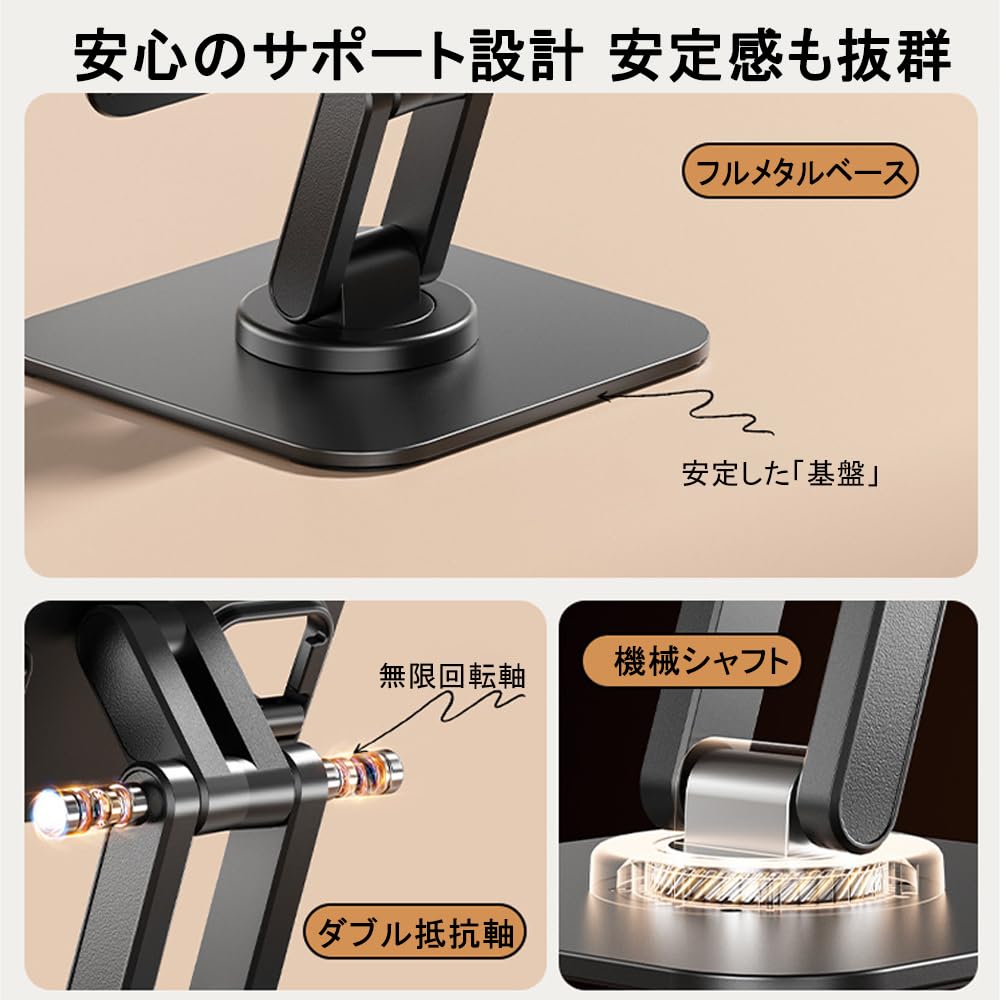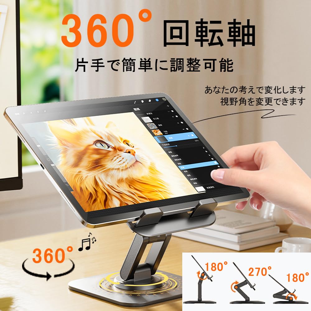 【高品質タブレットホルダー&360度回転】金属製のベース安定感があり、三軸で調整可能な支柱を採用し、最大650gまでサポートします。安定性が極めて良好ですが、機器の重量を掛けても傾くことはありません。置く面も大きくて大きめのタブレットを置いても安定性が高いです。ぐらつきを心配する必要はなく、どんな場所でも完璧に支えます。回転軸がゆるくならないように強化され、耐久性が高くなります。塗装は触った感触が非常に柔らかく、見た目も高級感があります。360°回転可能な台座付き、自由に端末の向きを調整できる新型のタブレットスタンドです。画面を共有する際、端末を動かす必要がなく、360回転台座で回転するだけで相手と簡単に画面を共有することができます。注意: 650g以下のデバイスをお勧めです。