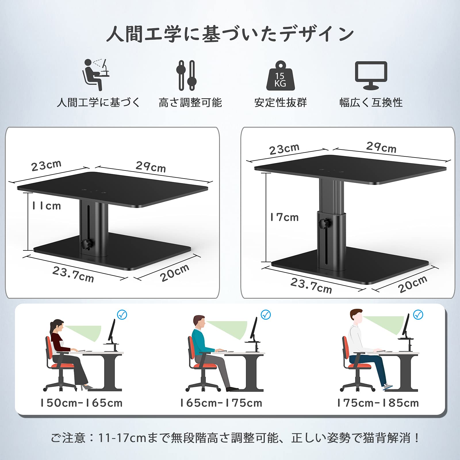 【幅広く互換性】デュアルモニター、PCモニター、パソコン、iMac、ノートPC、スピーカー、ディスプレイなどに幅広く対応可能なモニター台、机上台です。自宅、オフィス、寮やワークスペースへの追加に理想的。●モニタースタンドのサイズ:(天板)長約29cm×幅約23cm、(底板)長約23.7cm×幅約20cm、高さ11cm~17cmまで調節可能。モニター台重量:約2.8kg、安定性抜群。