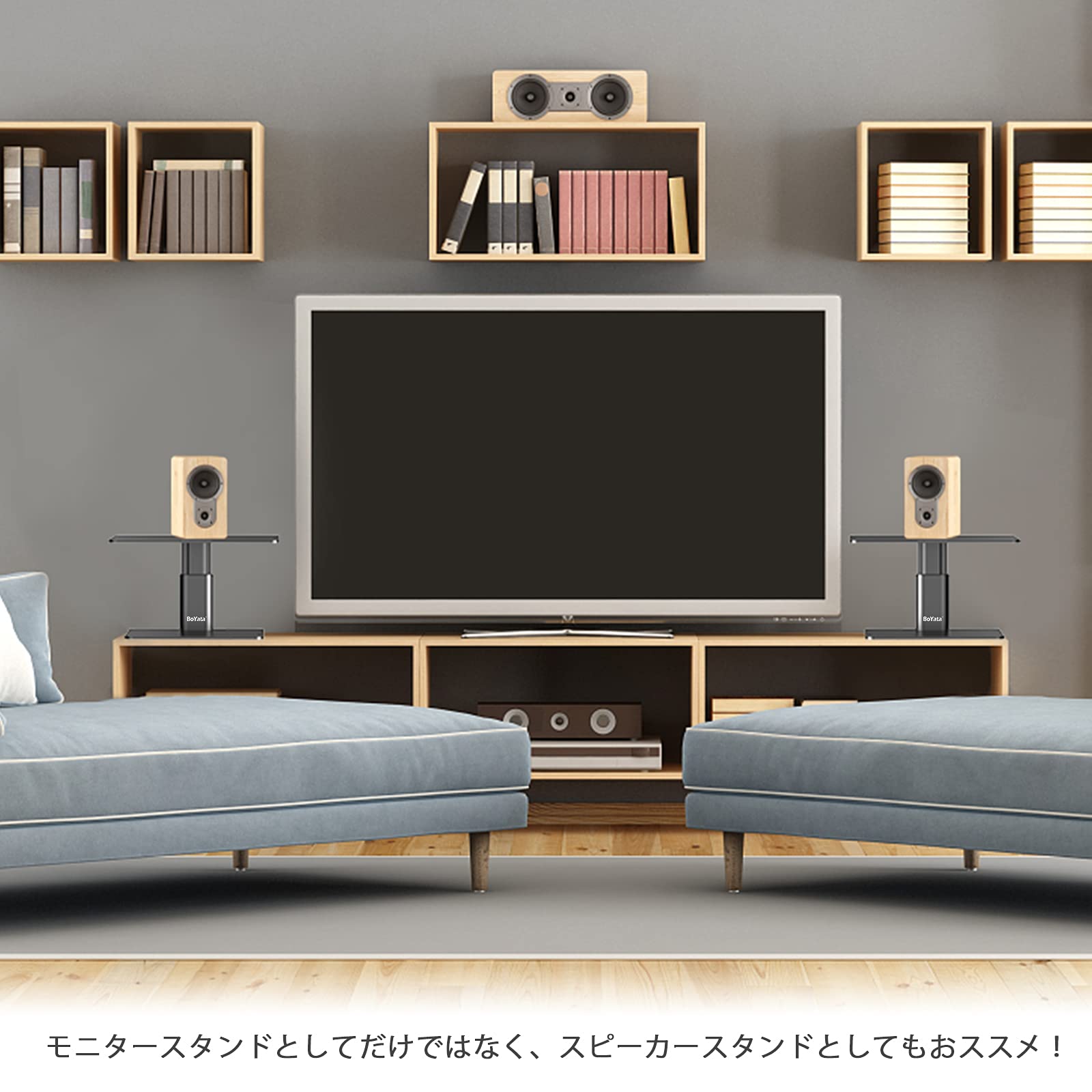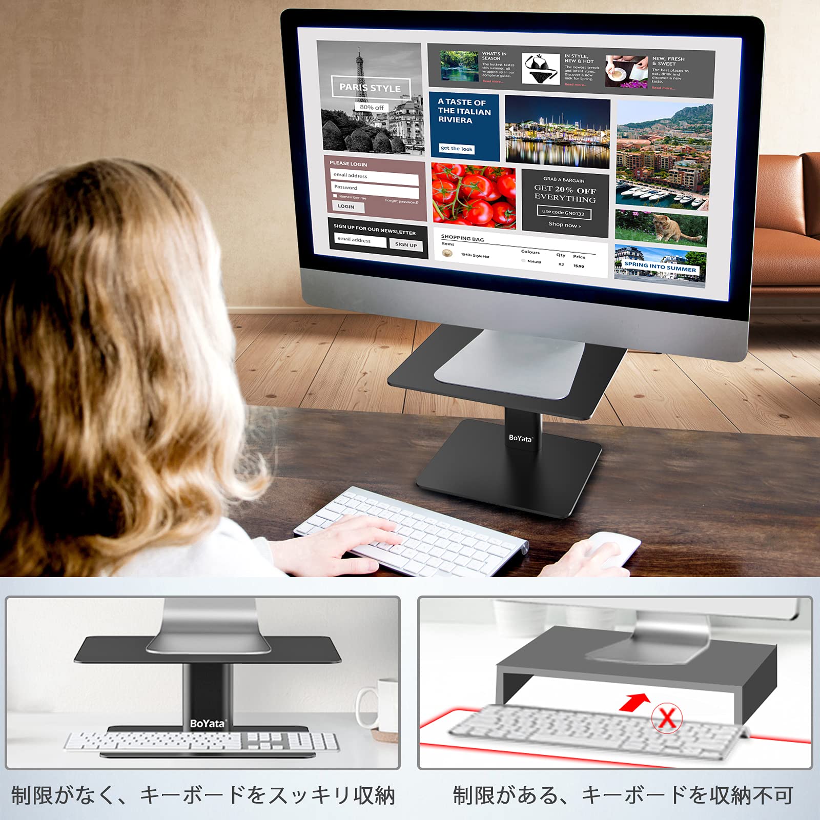 【スペース有効活用】●コの字のモニタースタンドと異なるのは、BoYataモニター台 机上台の魅力は横幅を取らなく、デスクスペースが有効活用できることです。一本支柱のデザインなので、下の段に収納するキーボードの幅を気にする必要がありません。時計や電源タップ、また種々のインターフェイスなども収納できて、テーブルに清潔感を保つことができます。