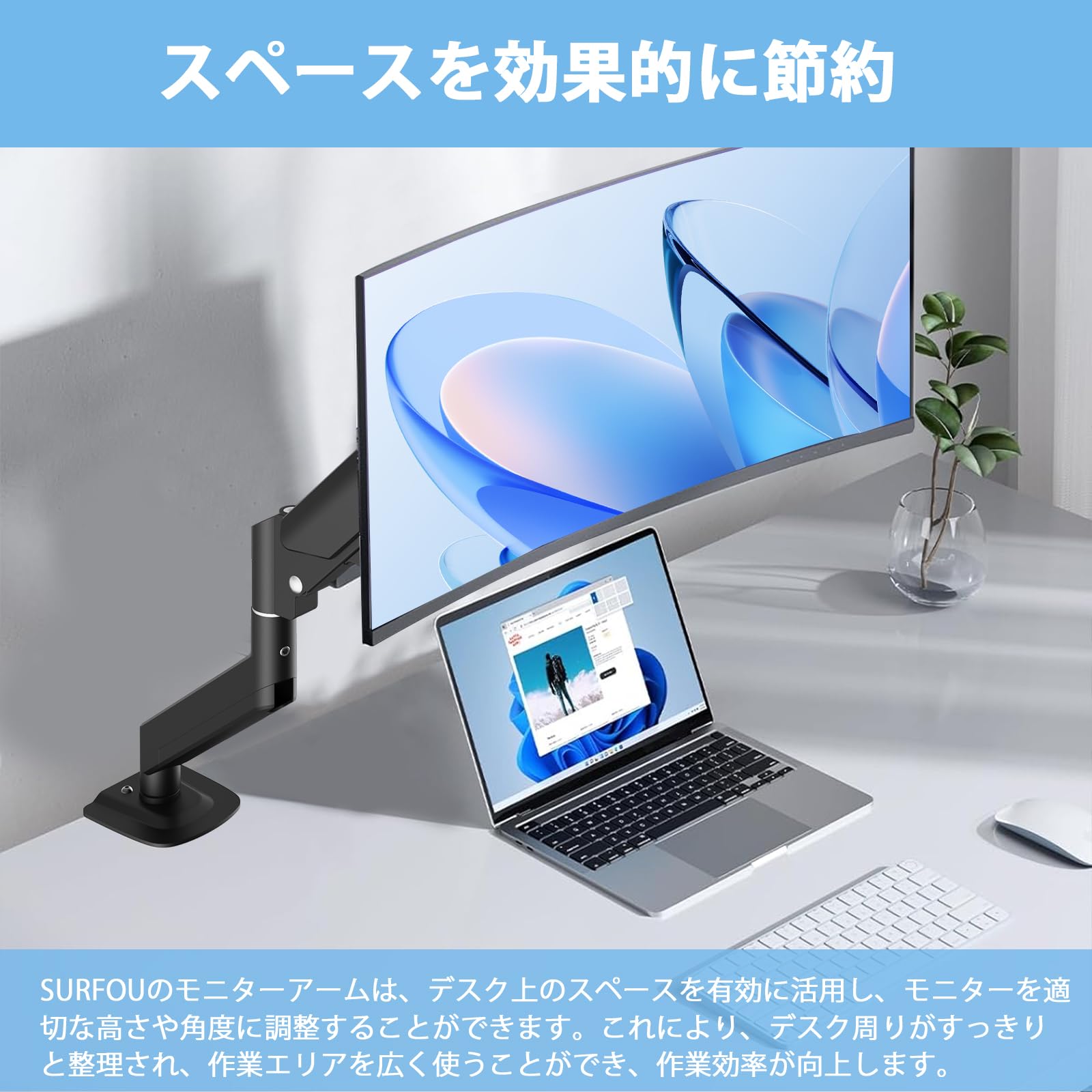 SURFOU モニターアーム モニタースタンド 最大32インチ対応 角度/高さ調整可能 VESA75×75/100×100mm ガススプリング式 pc ディスプレイ アーム シングルアーム ゲーミングモニター対応 耐荷重2~9kg スチール製 ケーブル収納 クランプ式&グロメット式