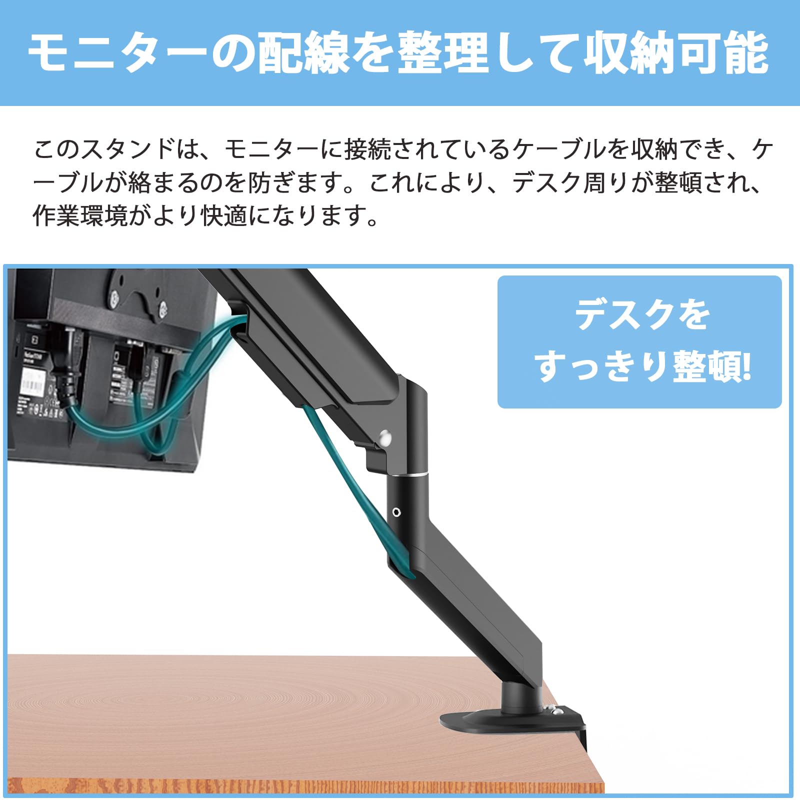 【さらに省スペース】従来のモニター台と比べて、このモニターアームはデスクトップに取り付けるためのベース部分のみを占めるため、デスクの使用スペースを広く、より整然と保つことができます。これにより、雑然とした環境を減らし、スッキリとした作業環境を実現します!ケーブル収納ラックが付いており、ケーブルを隠すことができるため、外観がよりスッキリと整然とします。