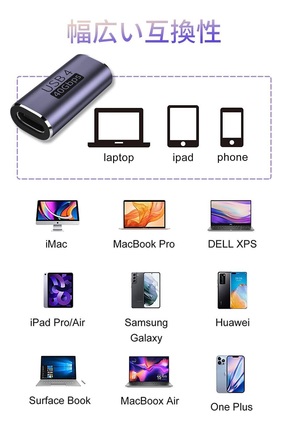 1.【USB Type C中継】USB Type C メス変換アダプタを使用すると、2本のUSB 4.0ケーブル(または2本のUSB 4.0デバイス、中継器の両端に接続された線伝送速度も40Gbpsの伝送速度に達しなければならない。)を簡単に接続して、延長ケーブルとして使用できます。USB3.0および1.1ポートとの下位互換性があります。デバイスのUSBインターフェースを効果的に保護し、長期間の使用によるUSBインターフェースの損傷しません。