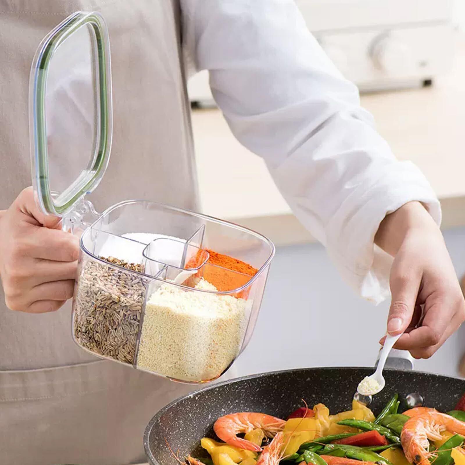 5つの独立スペース:こちらの調味料入れは、5つの独立した仕切りを備えており、塩、胡椒、砂糖、乾燥ハーブ、スパイスなど、さまざまな種類の調味料を分けてすっきり収納できます。取り出しやすく、調理中も効率的に使えます。