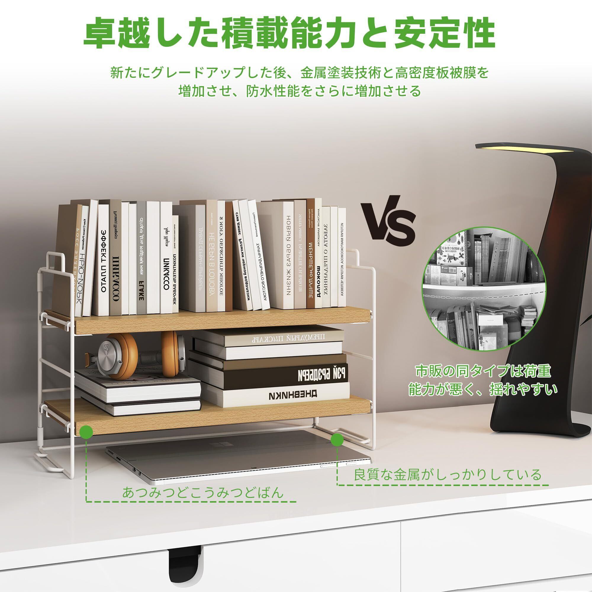 高品質材質:デスク上収納ラック本棚2段式は新たにグレードアップされた高品質金属と高密度複合板を完璧に組み合わせ、積載能力と曲げ抵抗能力を強化した。また、本棚が揺れにくいように、高字形の矩形構造を採用し、安定性を完璧に向上させた