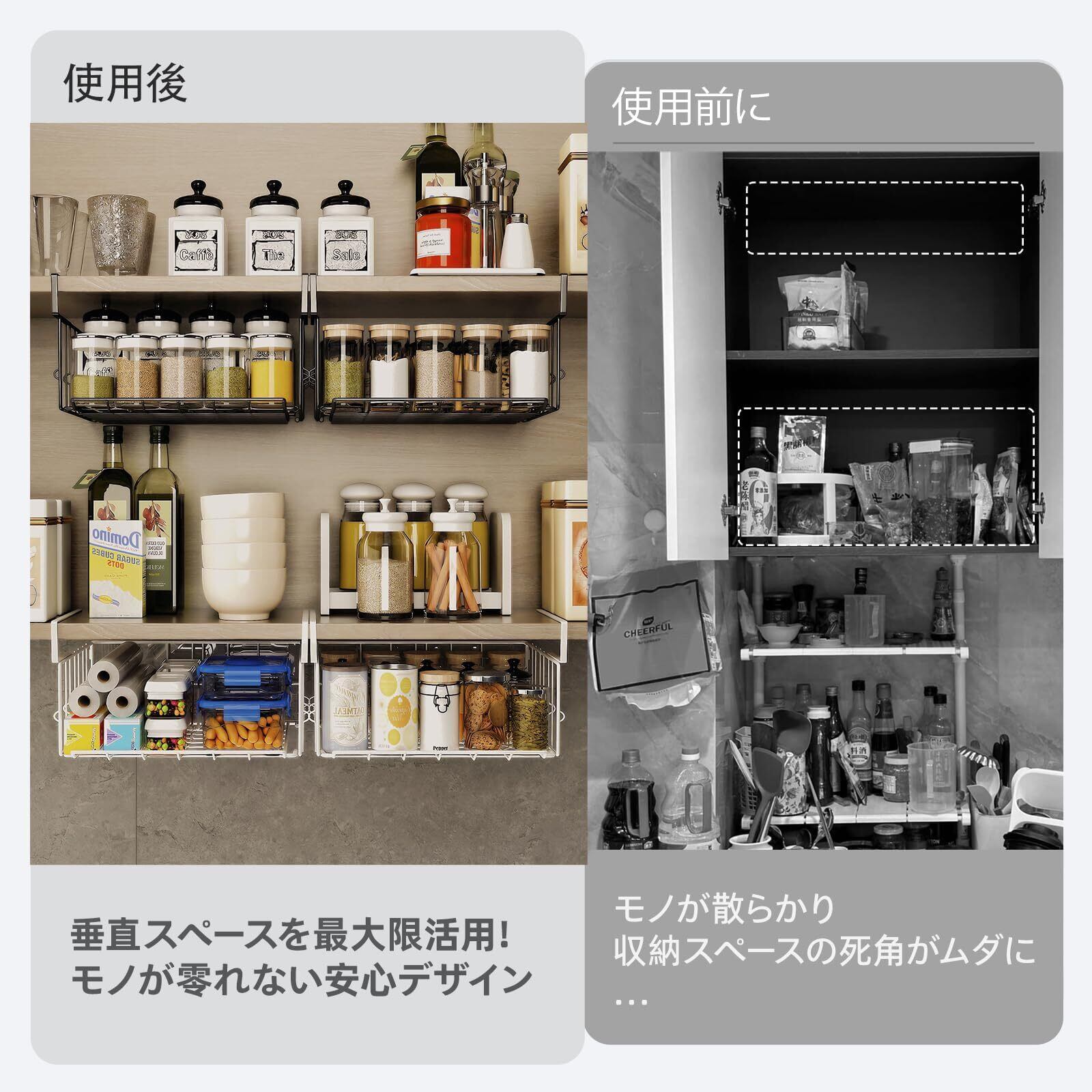【革命的なスライド式設置】ドリル不要の画期的なスライド設置方式。棚板にフックを引っ掛けるだけで3秒設置完了。厚さ0.5~3cmの吊戸棚/食器棚/クローゼット棚に幅広対応。開閉時の干渉防止設計で、重い食器を収納したままでもスムーズに扉の開閉が可能です