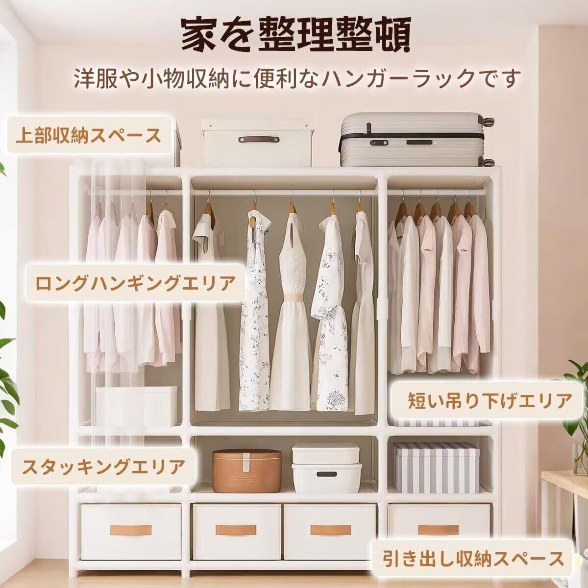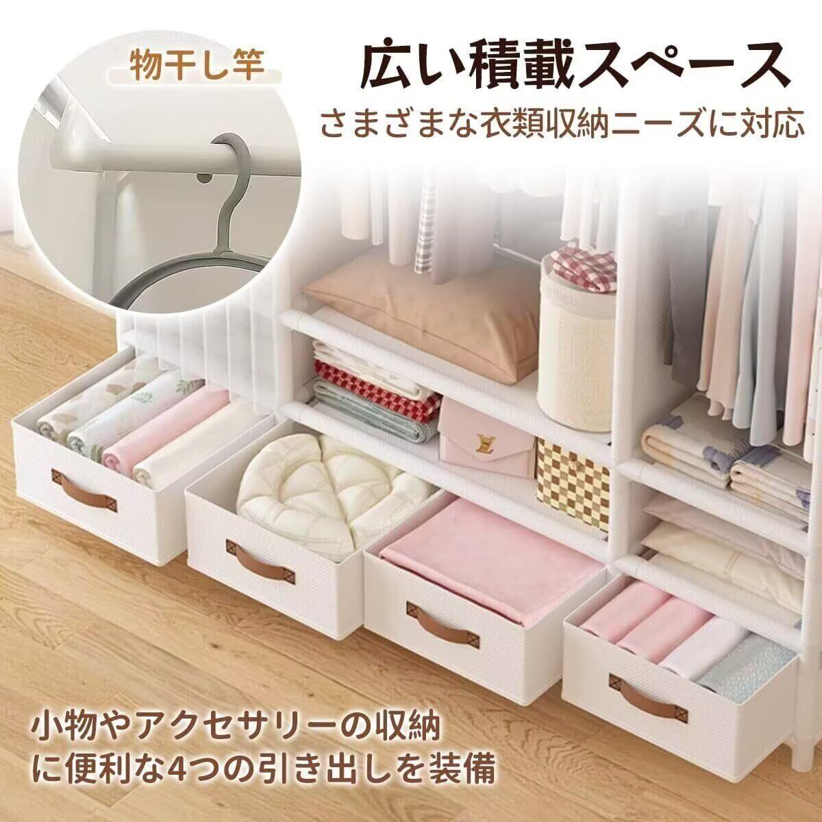 ワードローブ クローゼット ハンガーラック 大容量 幅144x奥行き45x高さ166.6CM 引き出し付き 衣類収納ラック カーテン式 洋服棚 整理棚 防水 防塵 防汚 頑丈 耐用 多機能 省スペース リビング 寝室 寮に最適 日本語説明書付き(白い)