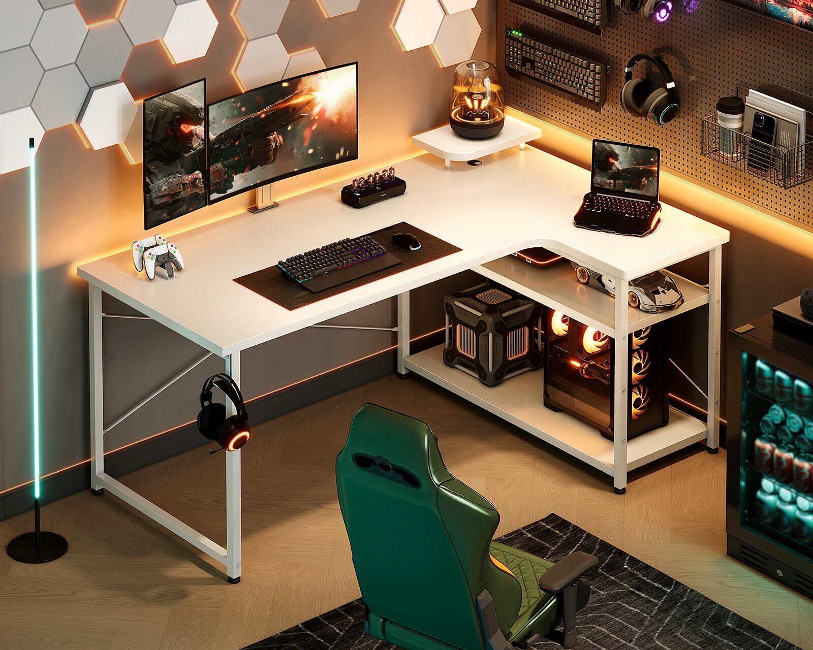 ODK ゲーミングデスク L字 パソコンデスク 幅110 デスク desk 机 pcデスク 棚付き オフィス ワーク 在宅勤務 桌子 作業机 組立簡単 ホワイト 右棚