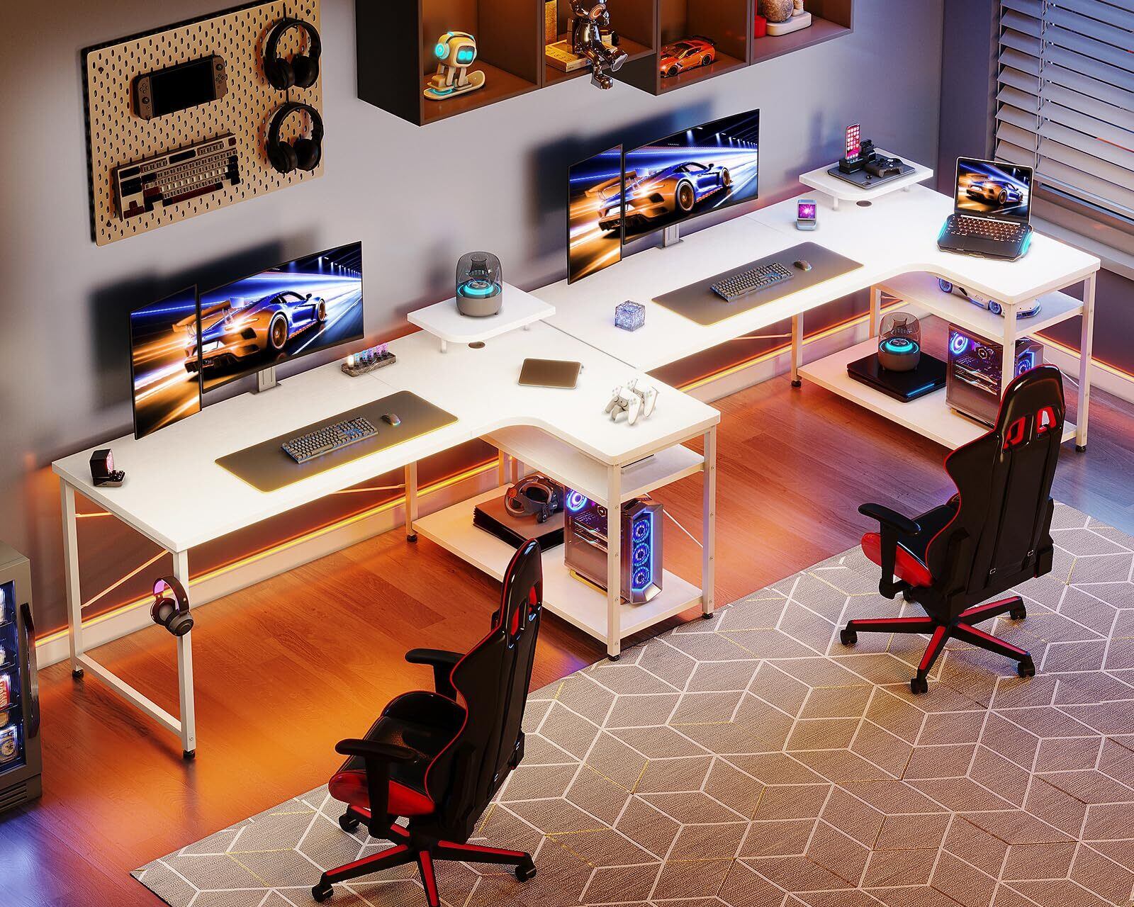 【ゲームと仕事両立】L字ゲーミングデスクは実用性が高く、ゲームプレイ、在宅勤務、書斎机、勉強机など様々なシーンで大活躍!モニター台を利用して目線をあげることで、作業時の姿勢を改善し、テレワークが快適になり、作業効率も格段に上がります。