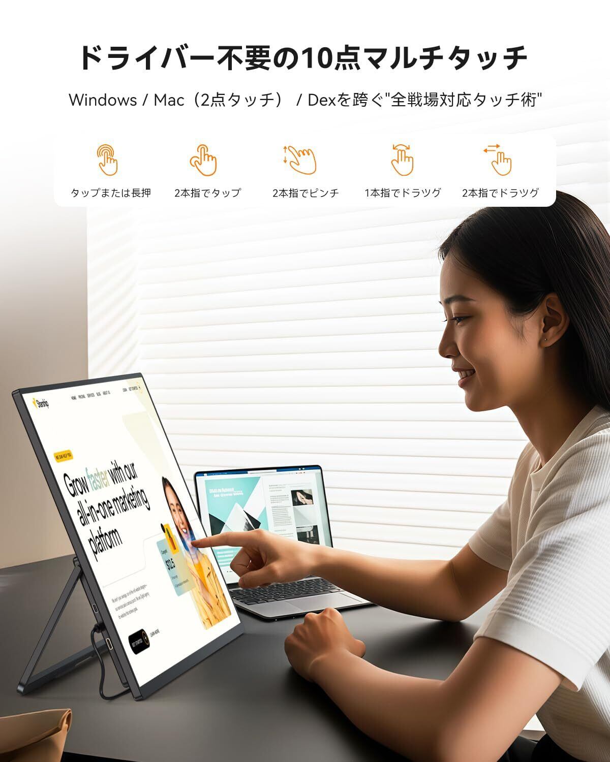 【圧倒的大画面&省スペース両立】24.5型モバイルモニター革新 ▶「ワイドデスク不要」在宅ワークの新基準◀ 従来14型比1.63倍の広視野を実現しながら、超薄型5mmボディでデスク空間を圧迫しません。新搭載の10点マルチタッチにより、指先やオプションペンでの直感的な操作が可能。 資料のスクロール、拡大縮小、メモ書きが格段にスムーズになり、マルチタスク作業の効率が飛躍的に向上。リモートワークや在宅トレーダー、動画編集者にとって、高い生産性を発揮する理想的な環境を提供します。180°調整可能なスタンドで、デスク上はもちろん、新幹線内など移動中のあらゆるシーンで即戦力となるでしょう。