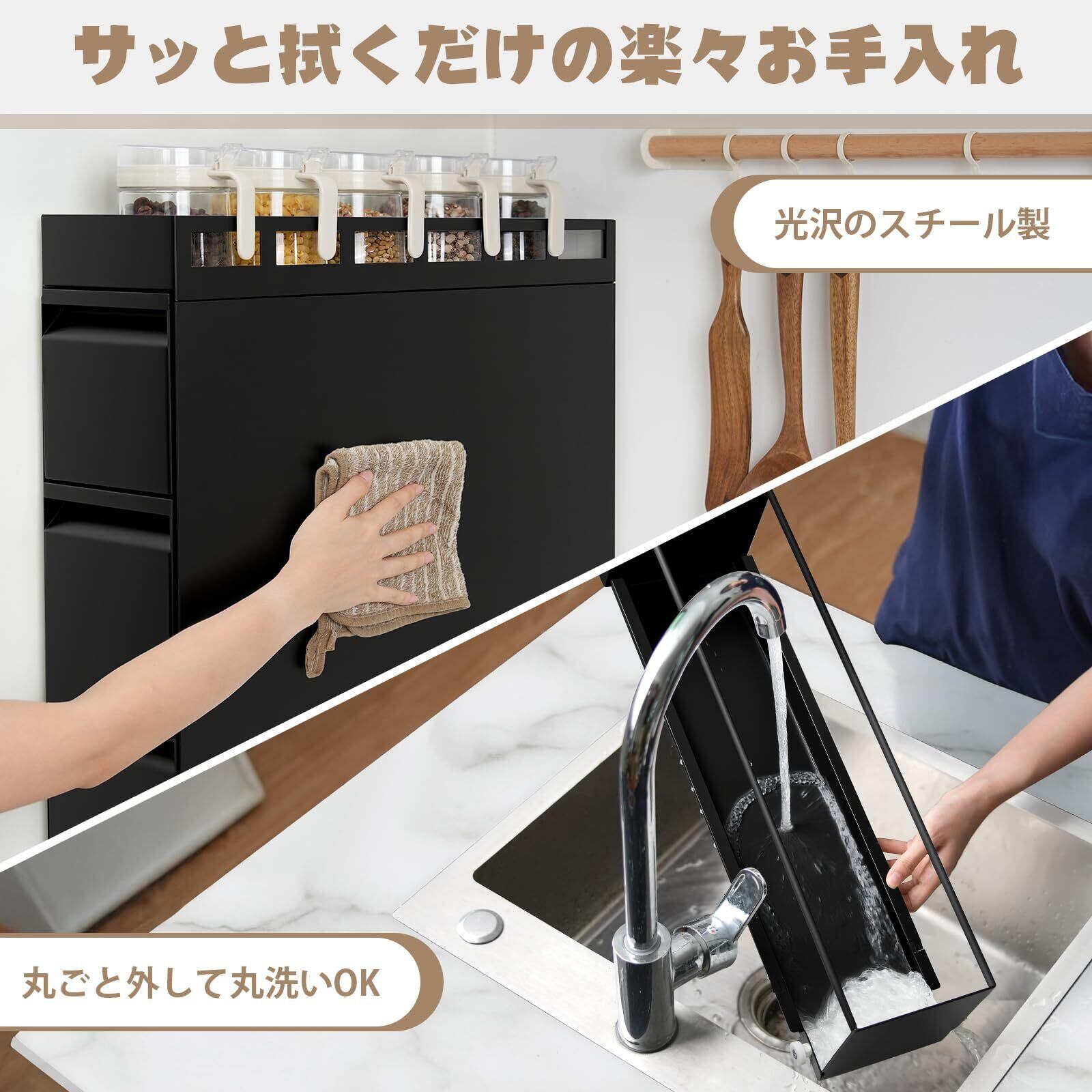 【サッと拭くだけの楽々お手入れ】光沢のあるスチールなので、油汚れなどもサッと拭くだけできれいに。引き出しは丸ごと引き出せるので、ラックの内部の掃除もラクラク。また、接地面四隅には、滑り止めシール付属しています。