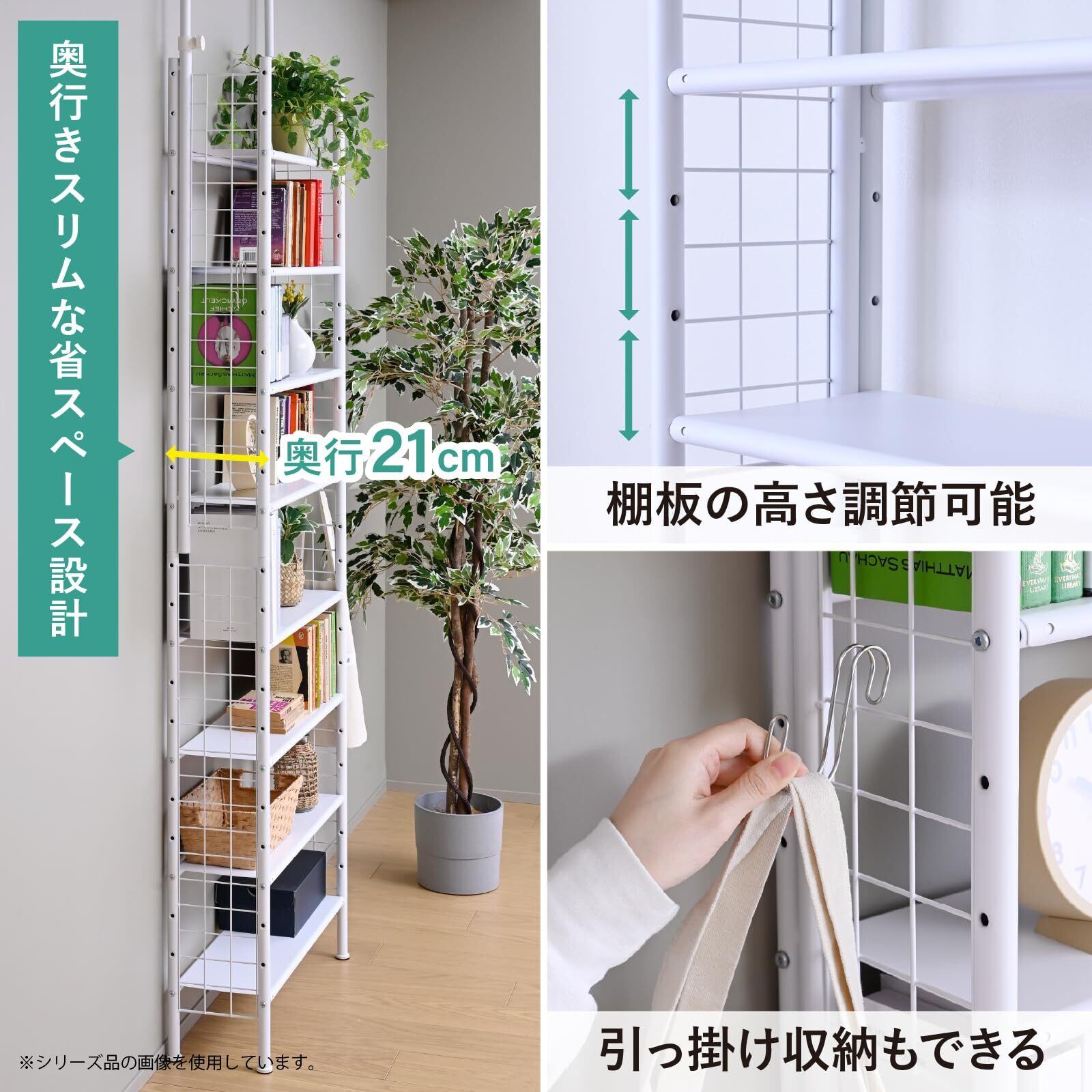 【奥行スリム】奥行21cmとスリムなのでリビングはもちろん、キッチンやランドリー、玄関など狭いスペースにも設置しやすいです。小物などを飾るディスプレイラックとしても活躍します。