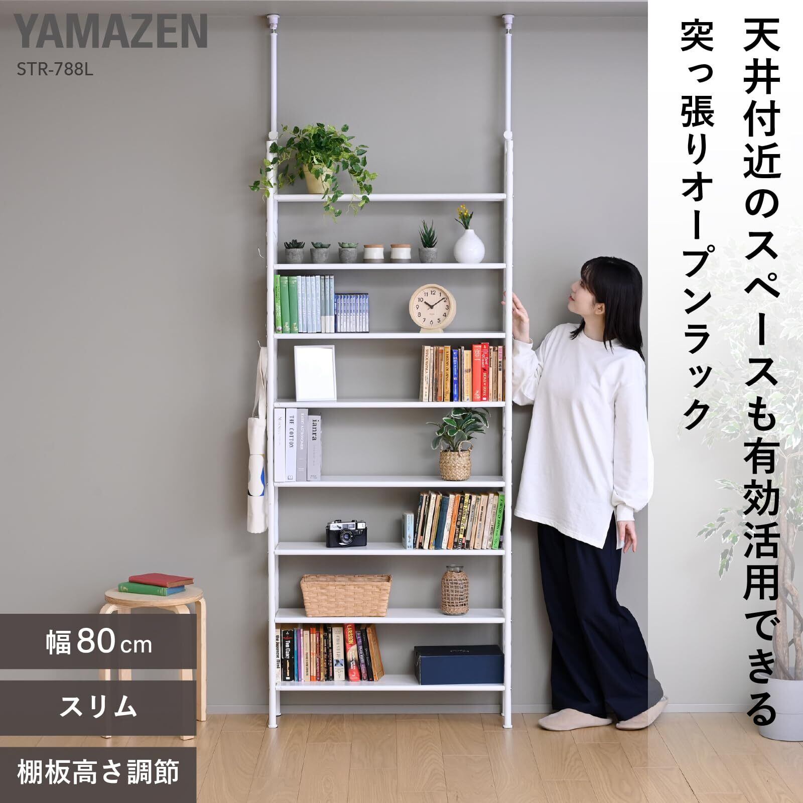 山善(YAMAZEN) 突っ張り ラック 8 段 スリム 全体耐荷重80kg 棚 オープンラック シェルフ 本棚 壁面収納 幅80×奥行21×高さ203-282cm 組立品 マットホワイト STR-788L(MWH)