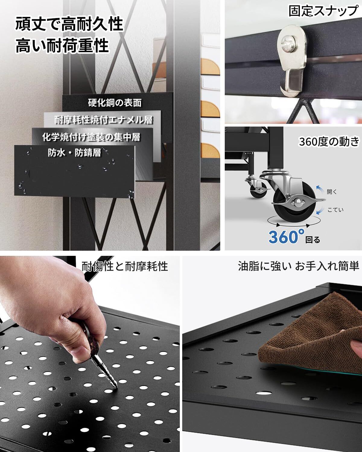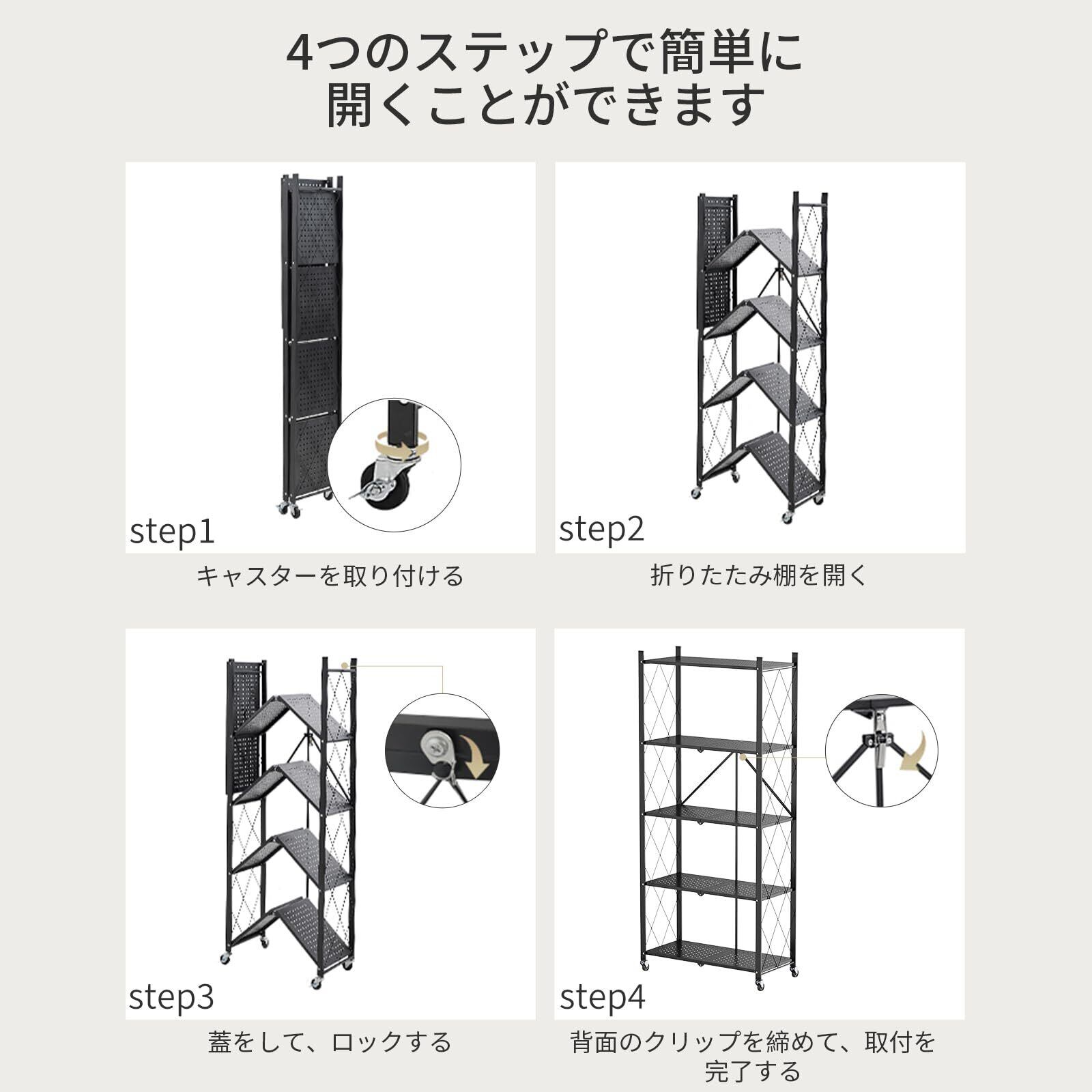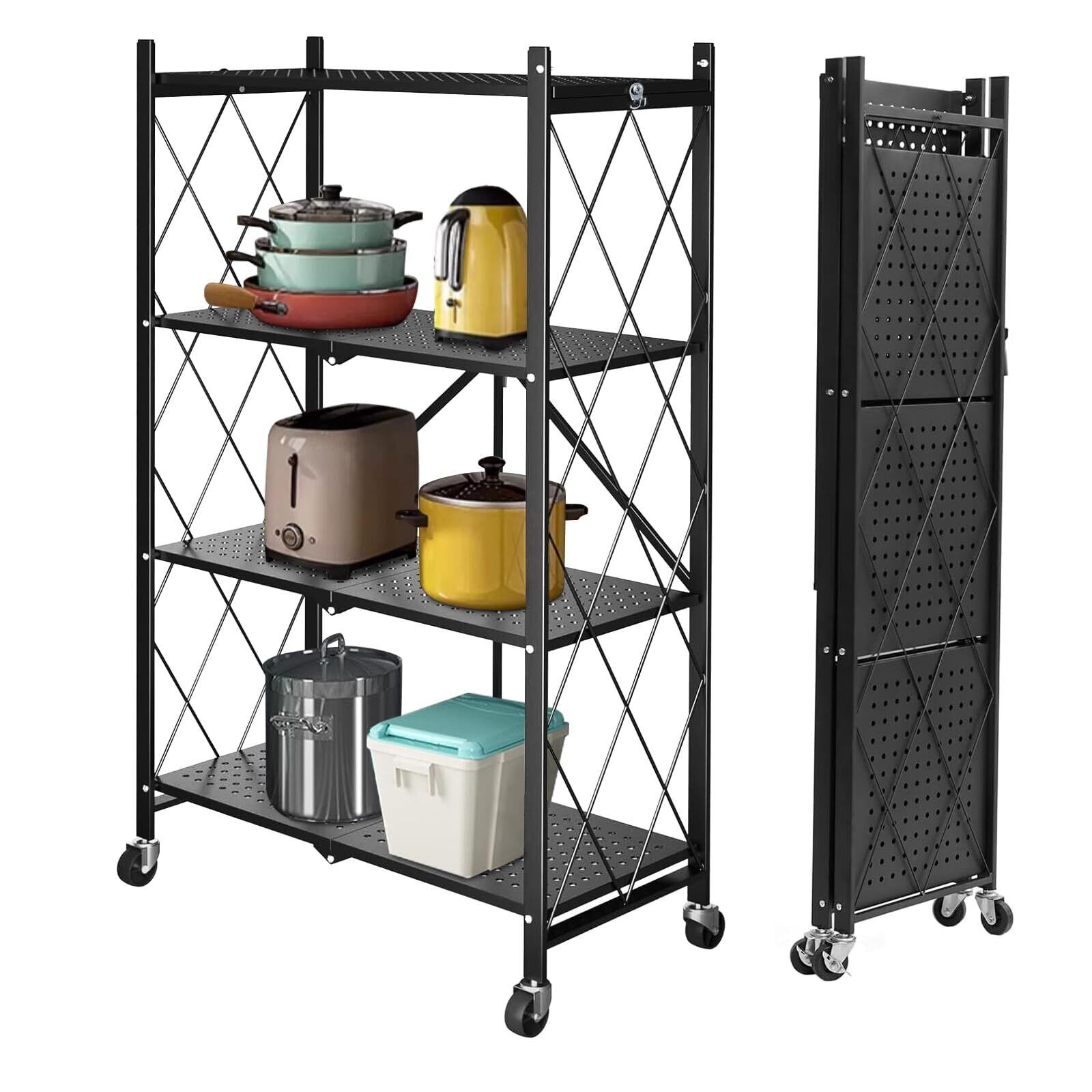 QIUYMI 折り畳みラック 棚ラック 4段 幅71×奥行34×高さ127cm 折りたたみ スチールラック メタルラック 収納ラック オープンラック 折りたたみ式 360°キャスター付き 防サビ 高耐久 省スペース 組立簡単 移動便利 家庭用収納 キッチン 寝室 (ブラック, 4段)