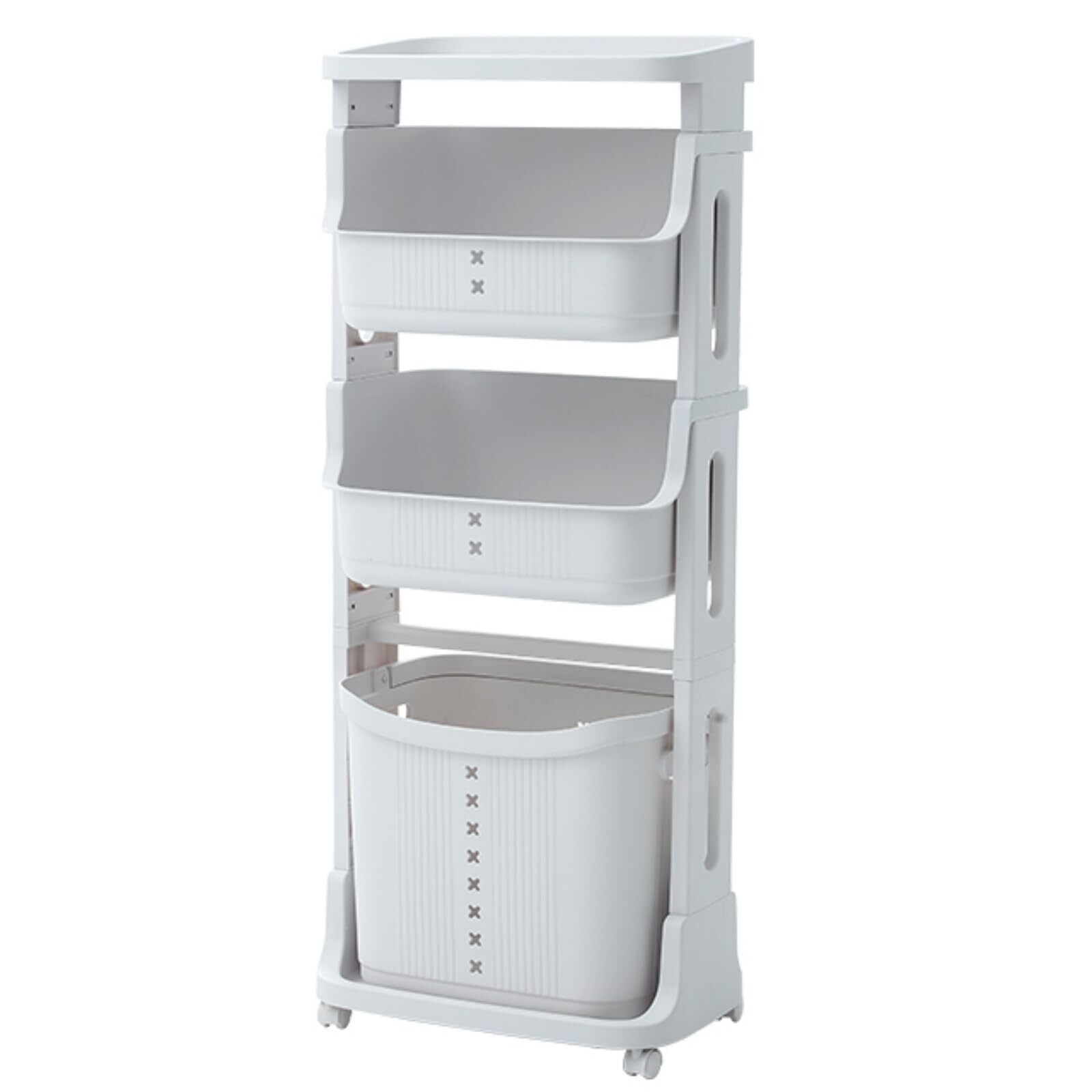 【ランドリーワゴン多層設計】: 収納ラック3 層に分かれており、各層に異なる種類のものを別々に入れることができます。トイレタリーやタオルは上部のバスケットに入れ、汚れた衣類はランドリー バスケットに入れることで、バスルームのスペースをより有効に活用できます。