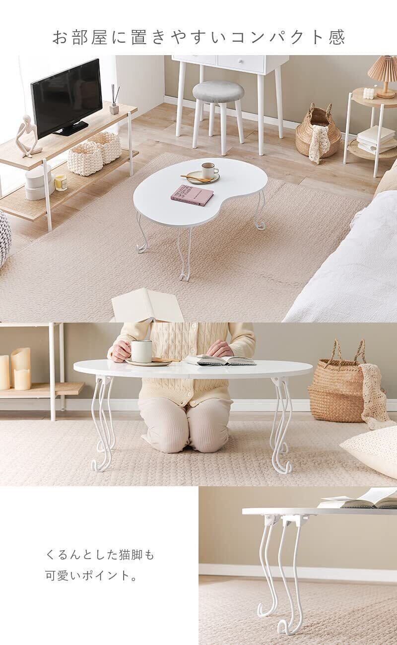 折りたたみ脚のビーンズ型テーブル。 丸形や楕円型とも違うオシャレなデザインの天板がポイント。 真っ白なホワイトカラーと猫脚が甘さを足してくれます。
