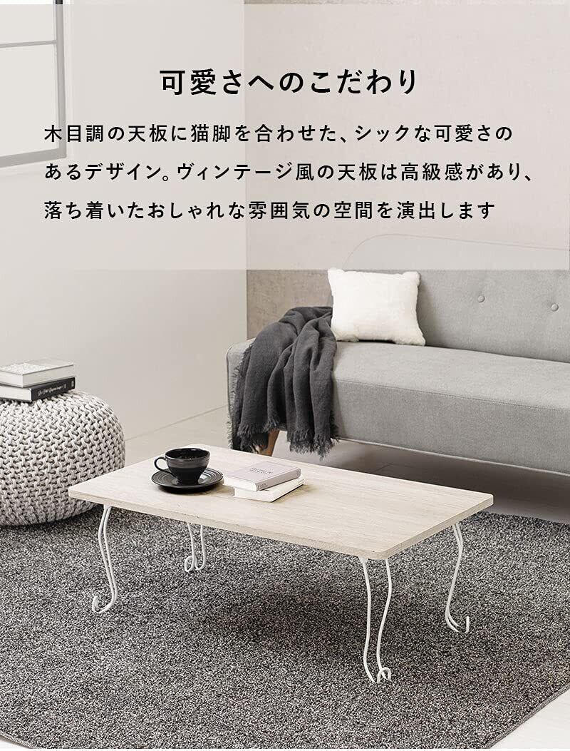 古木調の天板に猫脚を合わせた、シックな可愛さのある折りたたみテーブル。〈br〉コンパクトなので一人暮らしなどのワンルームや狭いお部屋、子供部屋などにおすすめ。〈br〉折りたたむとソファ下やちょっとした隙間に収納できるので、来客時のサブテーブルやリモートワーク、リモート授業専用のテーブルとしても活躍します。