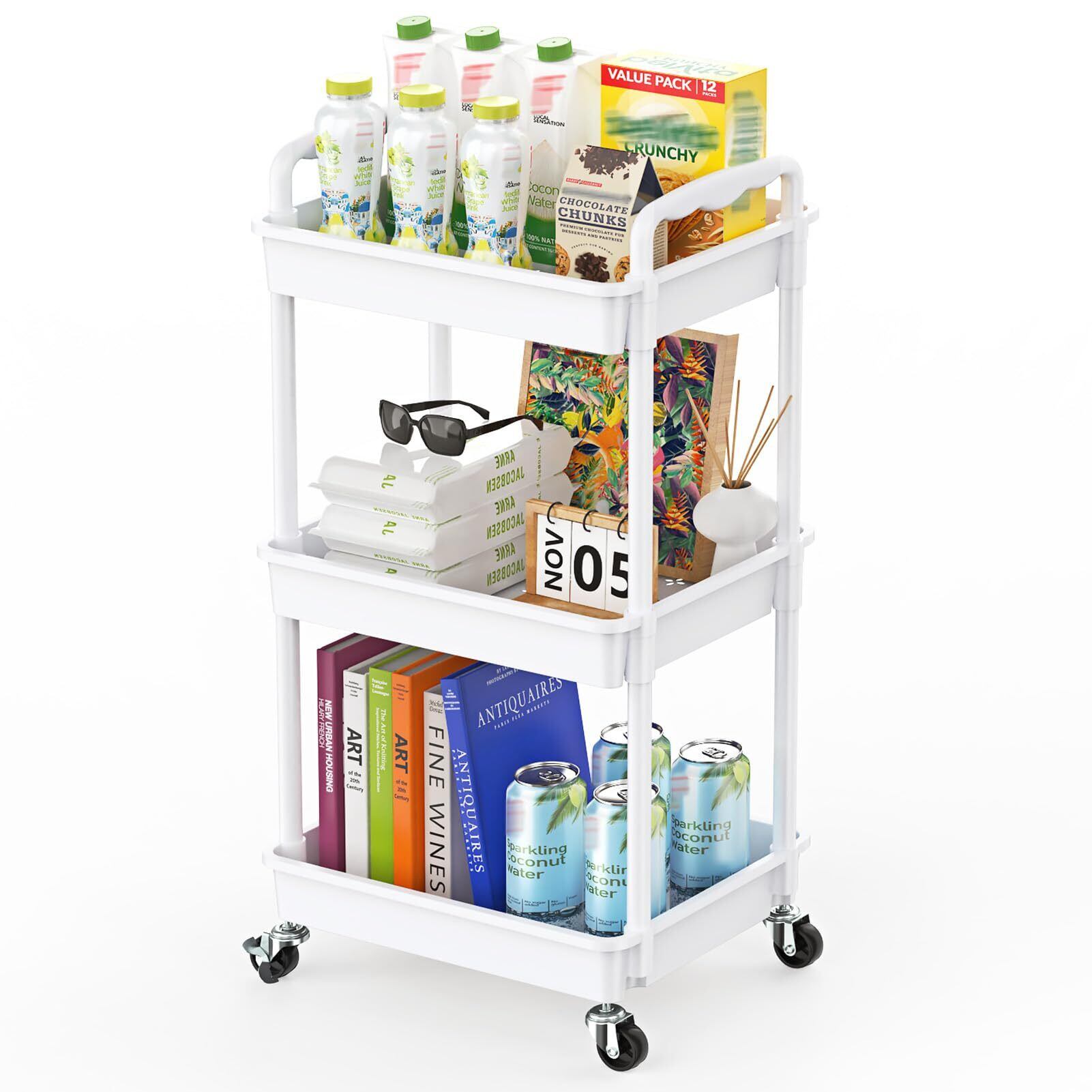 Goovilla キッチンワゴン ローリング 3段 ハンドル付き 移動式 隙間収納 バスケットラック バスルーム オフィス キッチン用 洗面所 頑丈 小物収納 収納ワゴン ホワイト