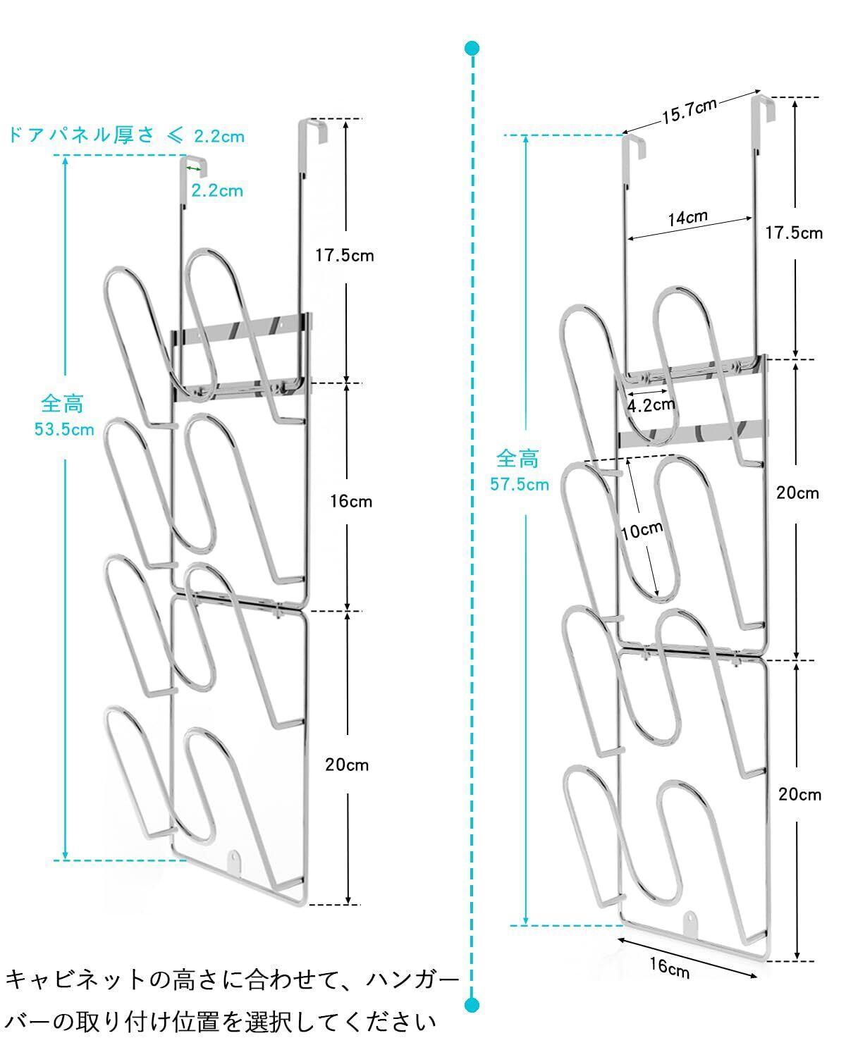 2 種類取り付け仕様:キッチンドア掛け式(厚さ 20mm 以内対応)・ネジ固定式両対応。