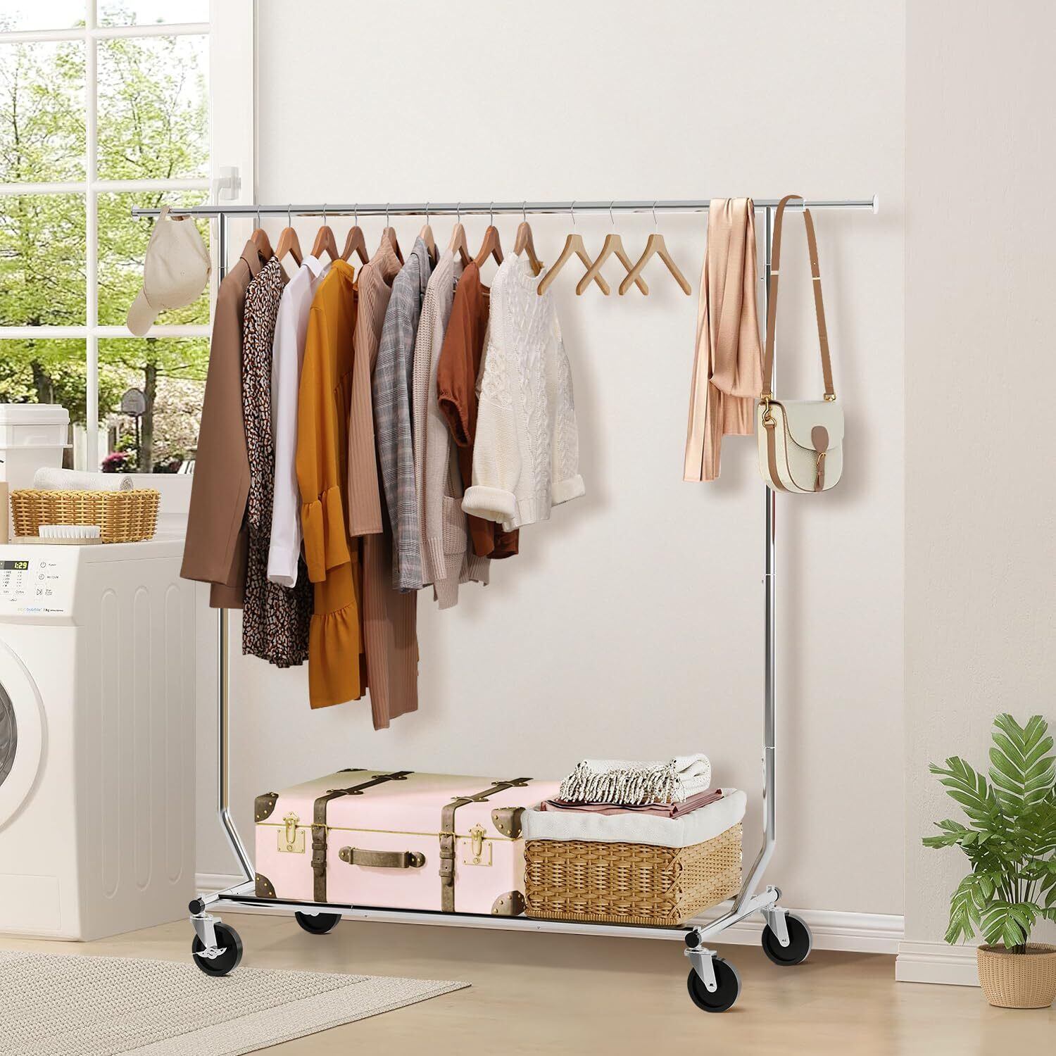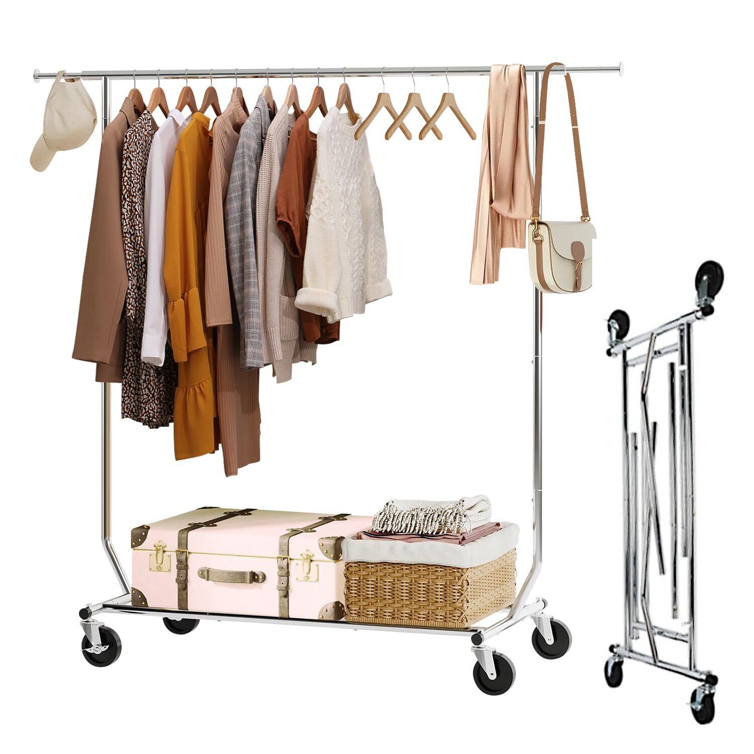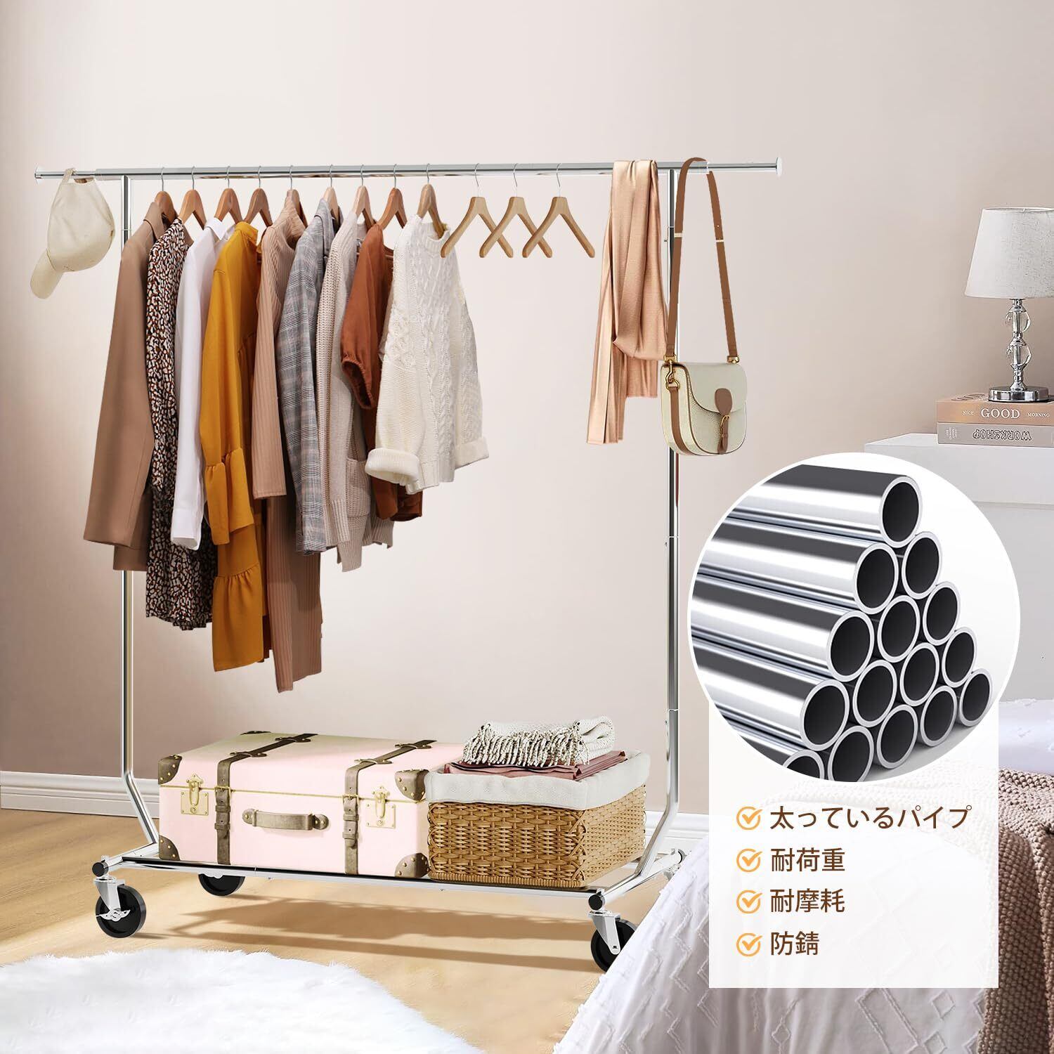 耐荷重150KG:高品質の金属で作られたこの折りたたみ式ハンガーラックは、最大150KG(ハンガーロッドに80KG、底棚に70KG)をサポートします。耐久性のあるクロムコーティングで水、錆、腐食、傷からの保護を強化します。