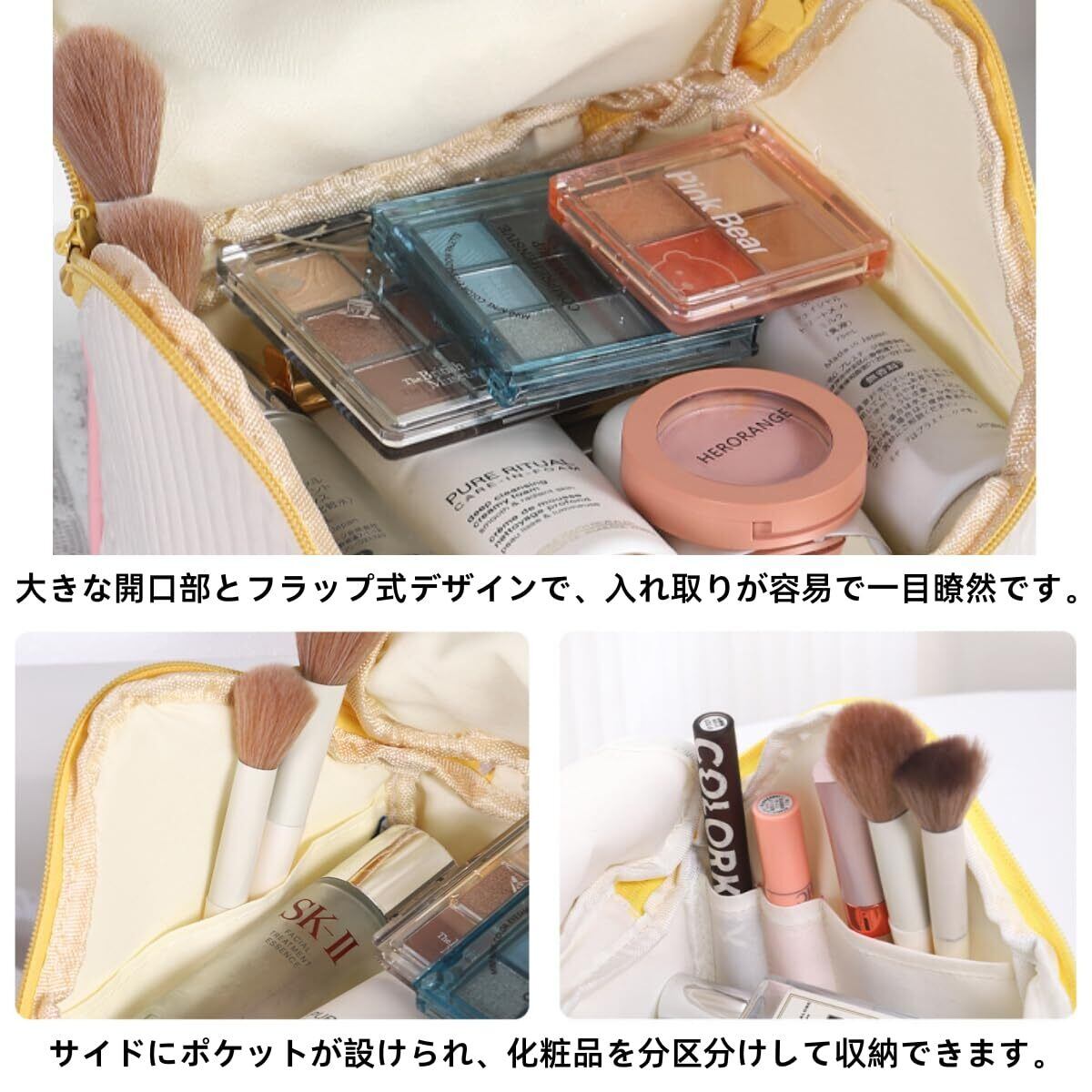 【安心して収納できるフリップトップデザイン】:内部スペースが広く、さまざまな化粧品を思い通りに収納できます。ダブルサイドポケットは合理的に分割されており、分類された収納が一目でわかるため、旅行や日常使用時の混乱を解消します。