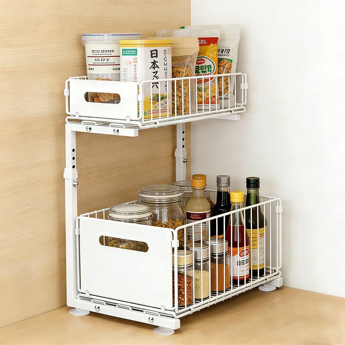 【コンパクト設計 & 大容量収納】商品仕様: 幅26.5×奥行38.2×高さ41~49cm (調整可能)。2段のスライド式引き出しがシンク下の奥行きを最大限に活用。L型オープンフレームで収納物が取り出しやすく、死角も有効利用できます。高品質炭素鋼製で最大30kgまで耐荷重。※ご購入前には設置スペースの寸法をご確認ください。
